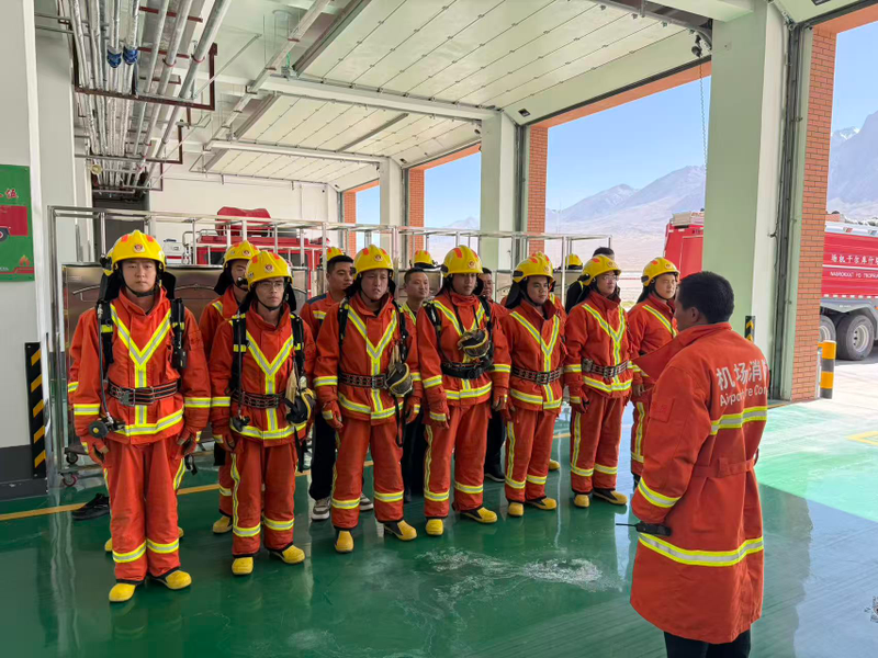 演练设定场景:一架执飞喀什-塔什库尔干航段的航班,飞行中因强阵风影响,左侧主起落架偏离跑道中线并偏出跑道端安全区,左侧停于土面区;起落架轮胎破损起火(无燃油泄漏),机上1名乘客受伤被困,需紧急救援与医疗处置。