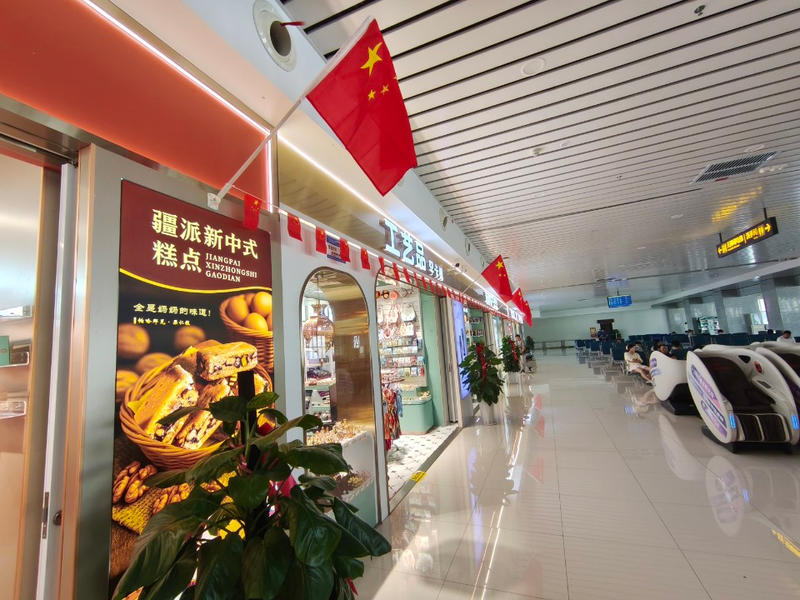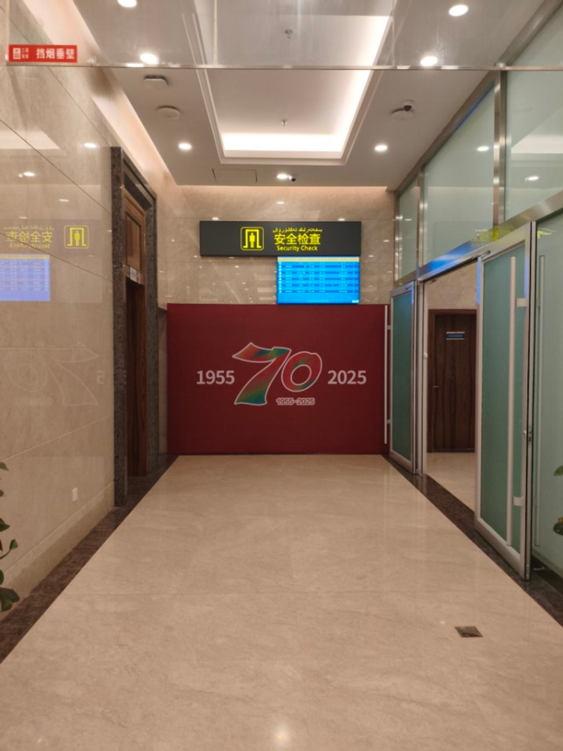 本次氛围营造工作主要围绕航站楼公共区域及贵宾室空间展开。贵宾室内设置了多处主题宣传设施,包括在安检通道前设置标注“1955-2025”时间范围和“70”周年标识的红色背景板,在贵宾厅一楼精心布置鲜花绿植以及写有“热烈庆祝新疆维吾尔自治区成立70周年”的大型展板。候机楼公共区域商铺同步参与氛围营造,多家商铺在醒目位置悬挂飘扬的中国国旗,将周年氛围与现代商业有机融合。