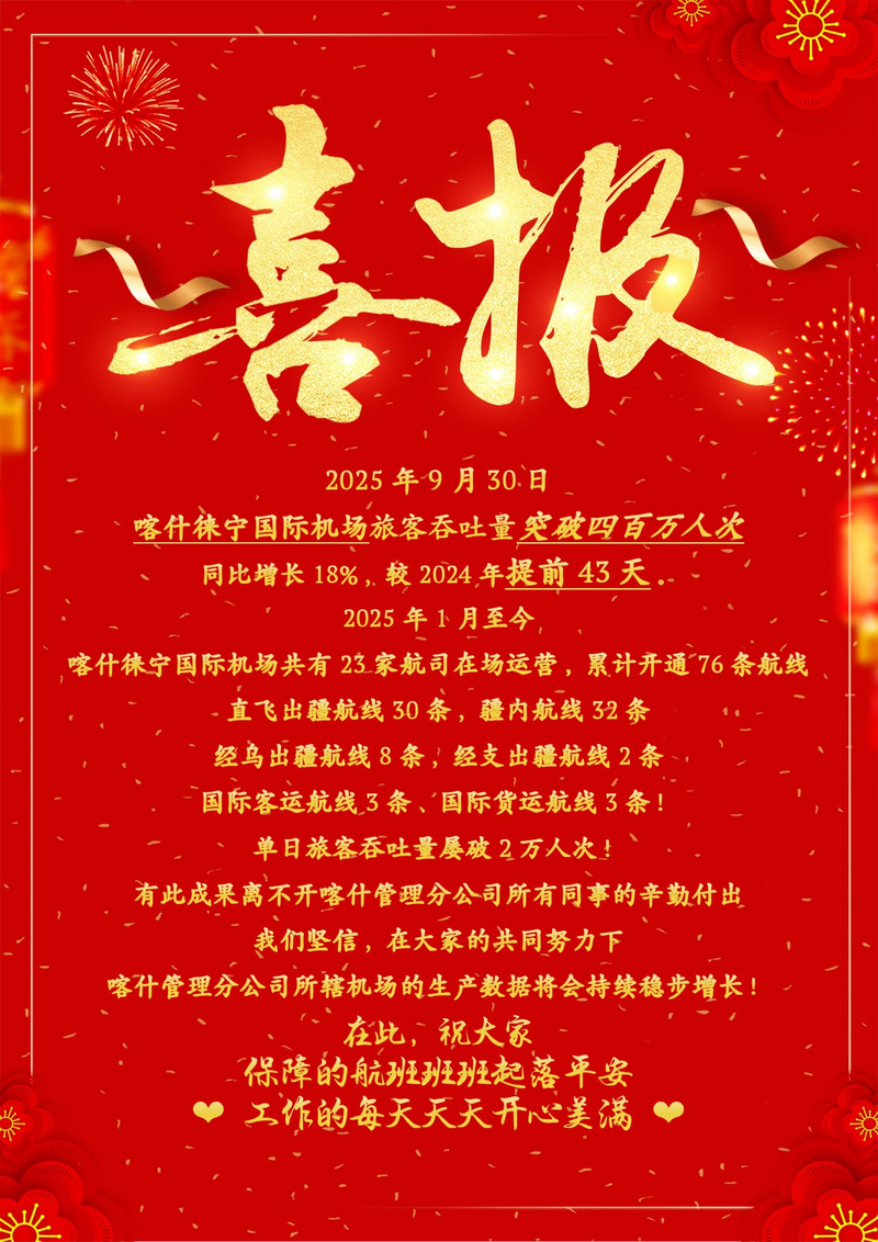 (通讯员:牛坚)2025年9月30日,喀什徕宁国际机场旅客吞吐量突破400万人次,较去年同期增长18%,较2024年提前43天实现该目标。自8月6日旅客吞吐量突破300万人次以来,机场在不足两个月时间内再次实现百万级增长,充分体现了喀什地区航空运输市场的强劲活力和持续向好的发展态势。