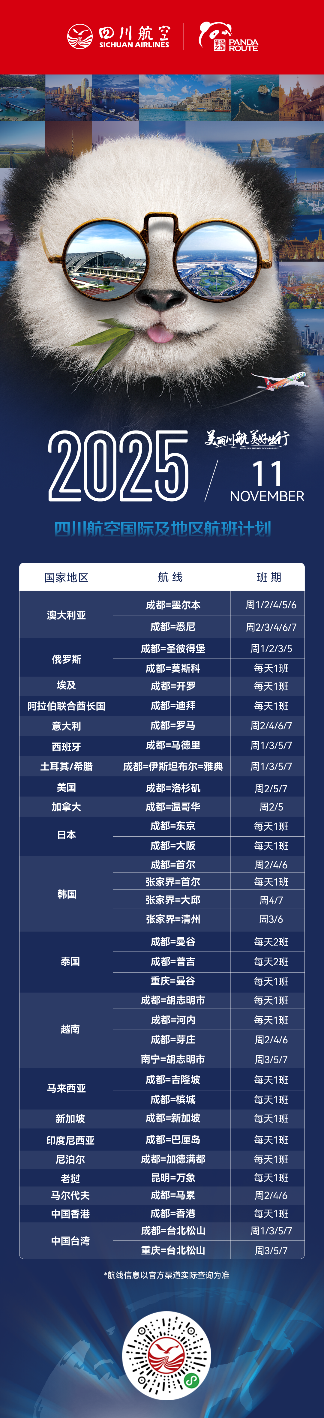 川航发布11月国际及地区航班计划 航空运输头条 航企通讯滚动 航线航班 10月13日 编辑 通讯员mk 取消关注 关注 私信 四川航空2025年11月国际及地区航班计划来咯 计划执飞31条国际航线 3条港台地区航线 四川航空国际航班计划