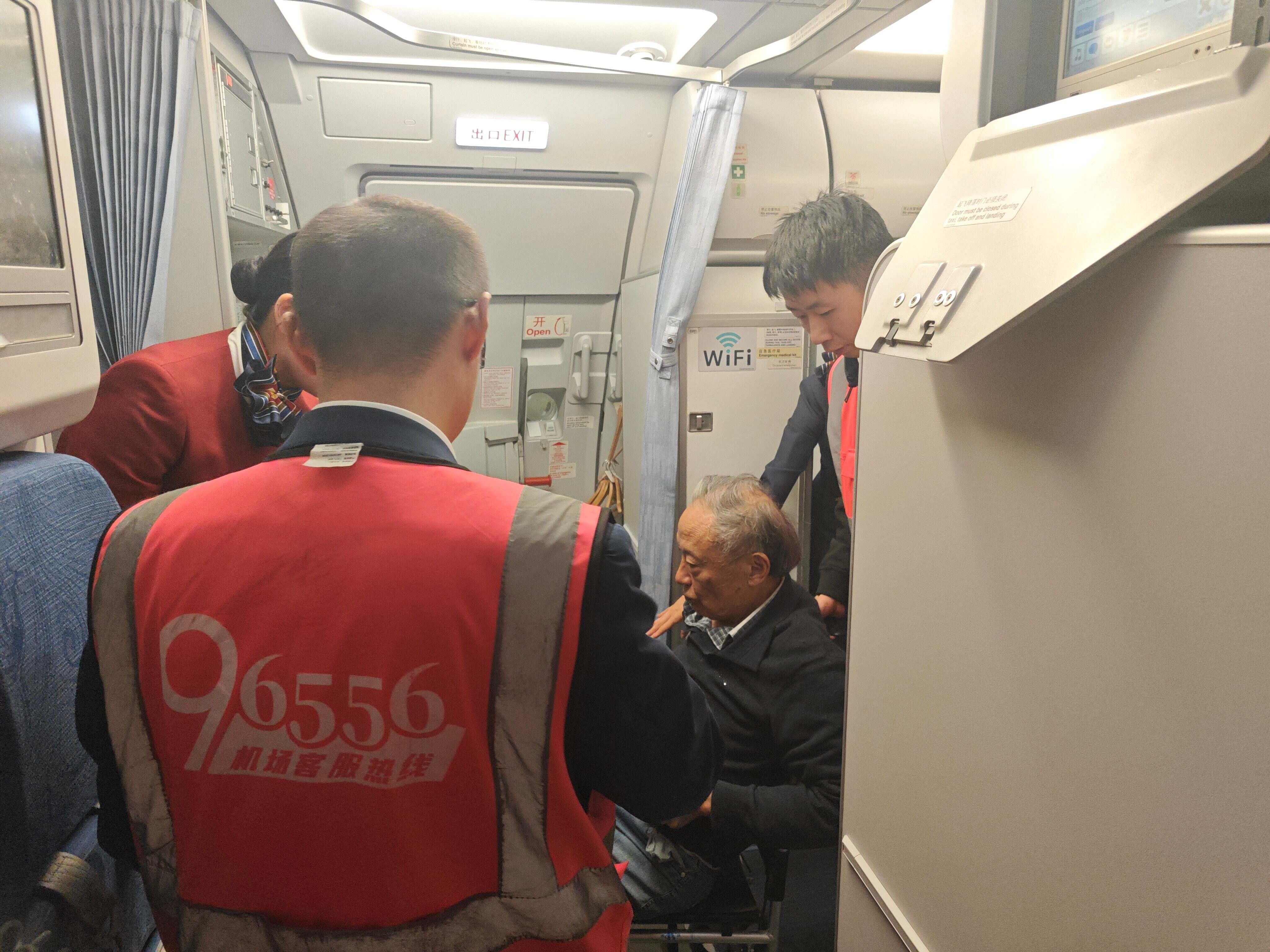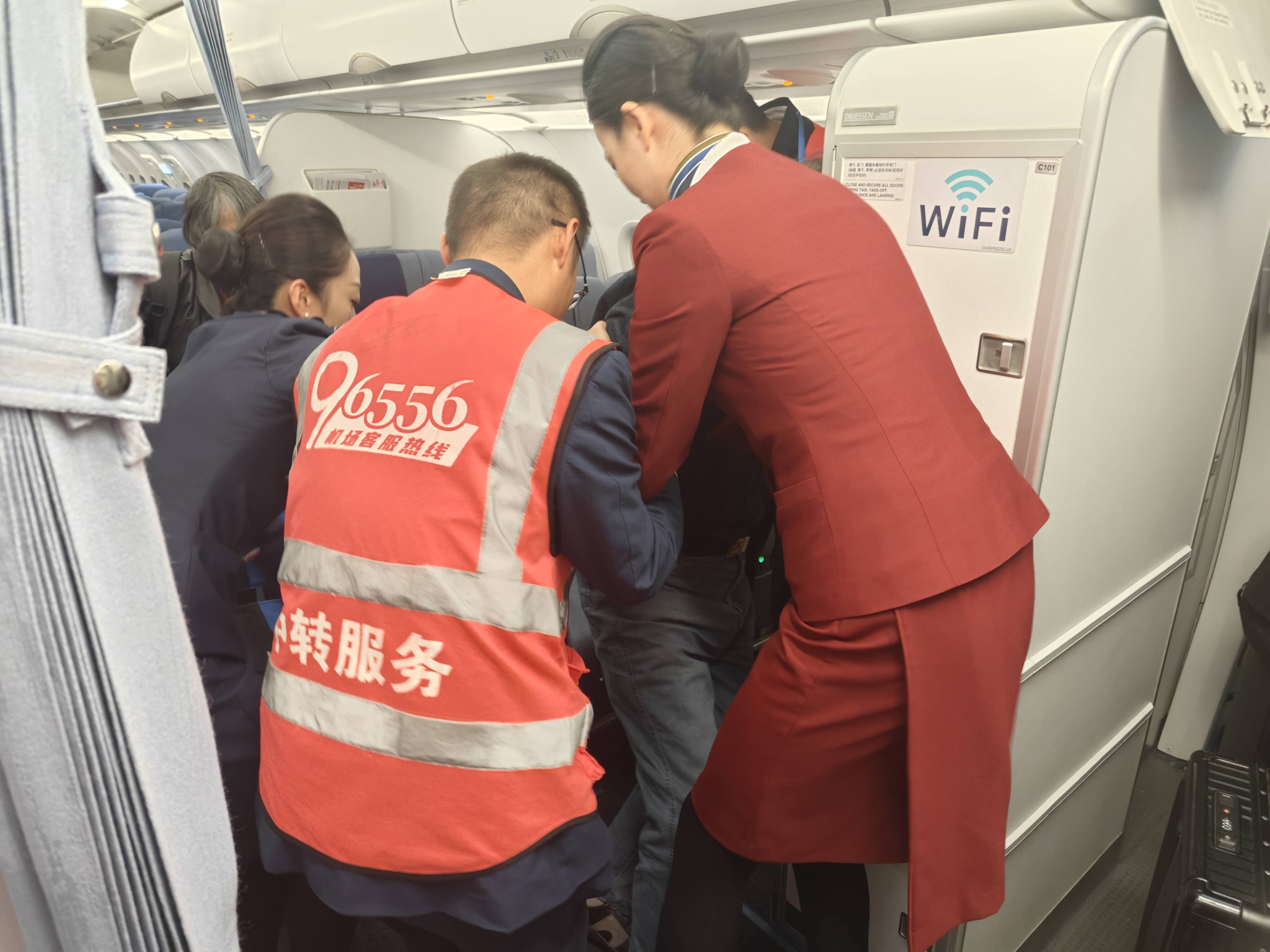抵达机舱口后,工作人员默契分工:一位稳稳托住旅客背部与肩部,一位小心护住腿部与腰部,两人同步调整发力节奏,动作轻柔且平稳,生怕牵动旅客伤口。行进中,不时轻声提醒,密切留意旅客表情,随时准备调整动作。待一切安置妥当,旅客及同行人员眼中满是感激,向工作人员再三致谢。