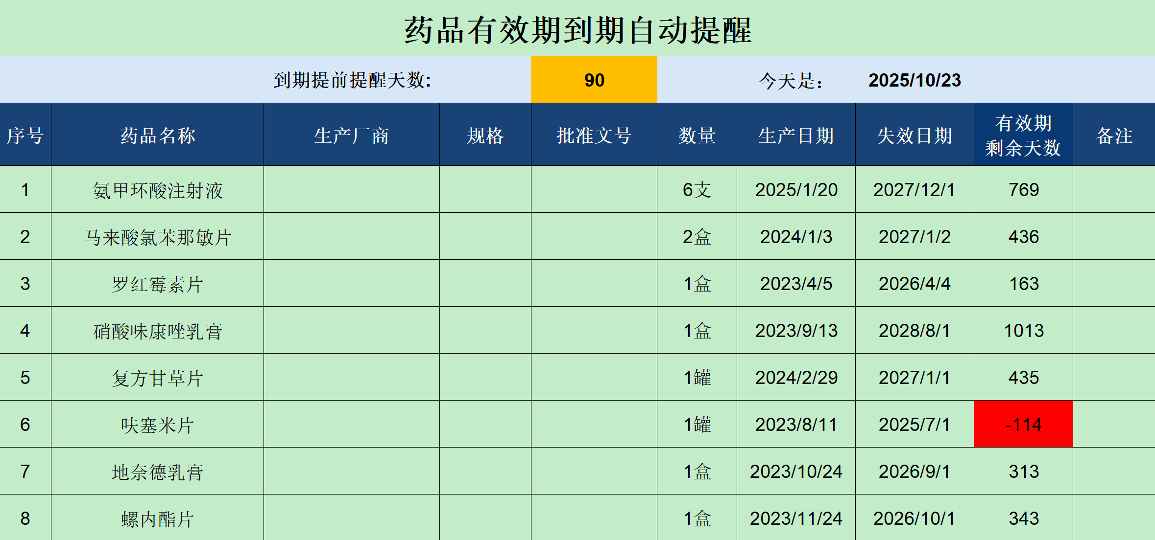 - 智能天数计算:自动精准核算每款药品的 “有效期剩余天数”,如氨甲环酸注射液剩余 769 天、硝酸咪康唑乳膏剩余 1013 天等,药品效期状态一目了然;