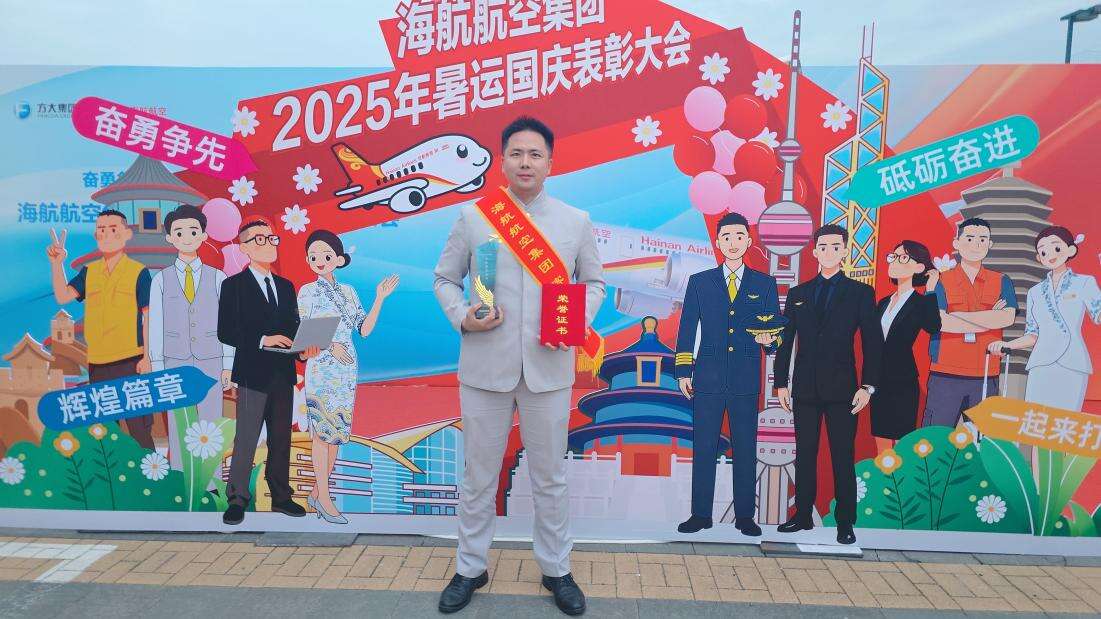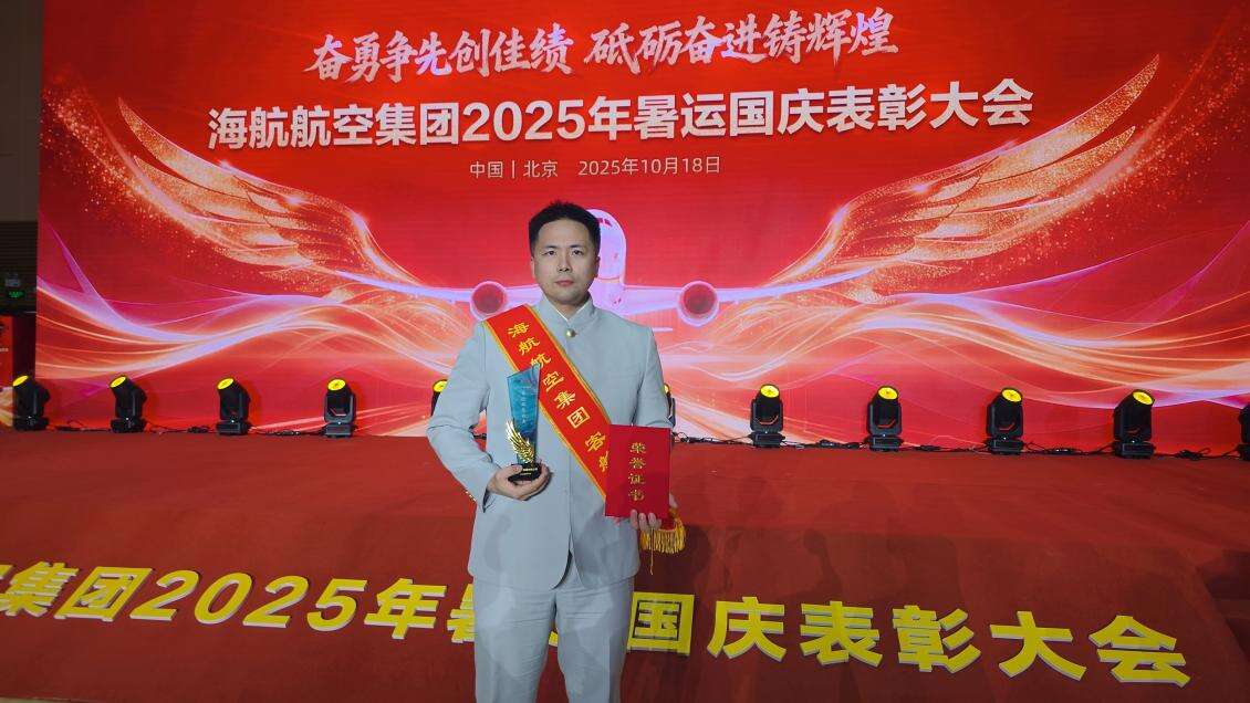在2025年暑运国庆出行高峰航班保障期间,严成始终以最高标准严格要求自己,恪守规章流程,圆满完成了各项航班保障工作,荣获新海航航空集团2025年暑运国庆“客舱服务标兵”荣誉称号。