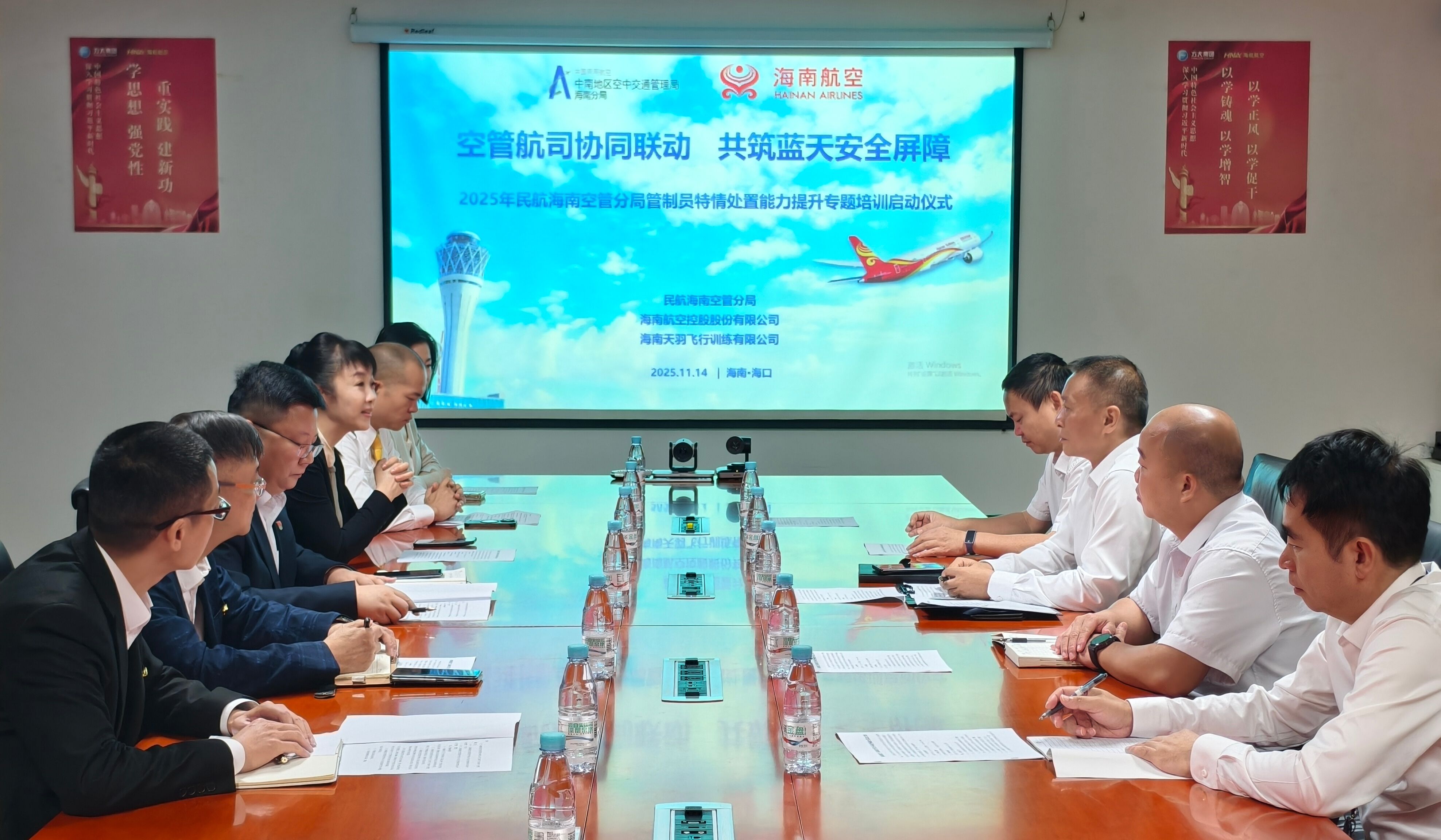 (通讯员:符鑫)11月14日上午,民航海南空管分局局长麦丰带领分局一行前往海南天羽飞行训练有限公司,参加管制员特情处置能力提升专题培训启动仪式暨业务融合活动。本次活动以“空管航司协同联动,共筑蓝天安全屏障”为主题,由民航海南空管分局联合海南航空控股股份有限公司、海南天羽飞行训练有限公司共同举办,聚焦管制员特情处置能力提升及地空协同配合强化,通过实地观摩、业务研讨等形式,深化地空合作,筑牢空中交通安全防线。