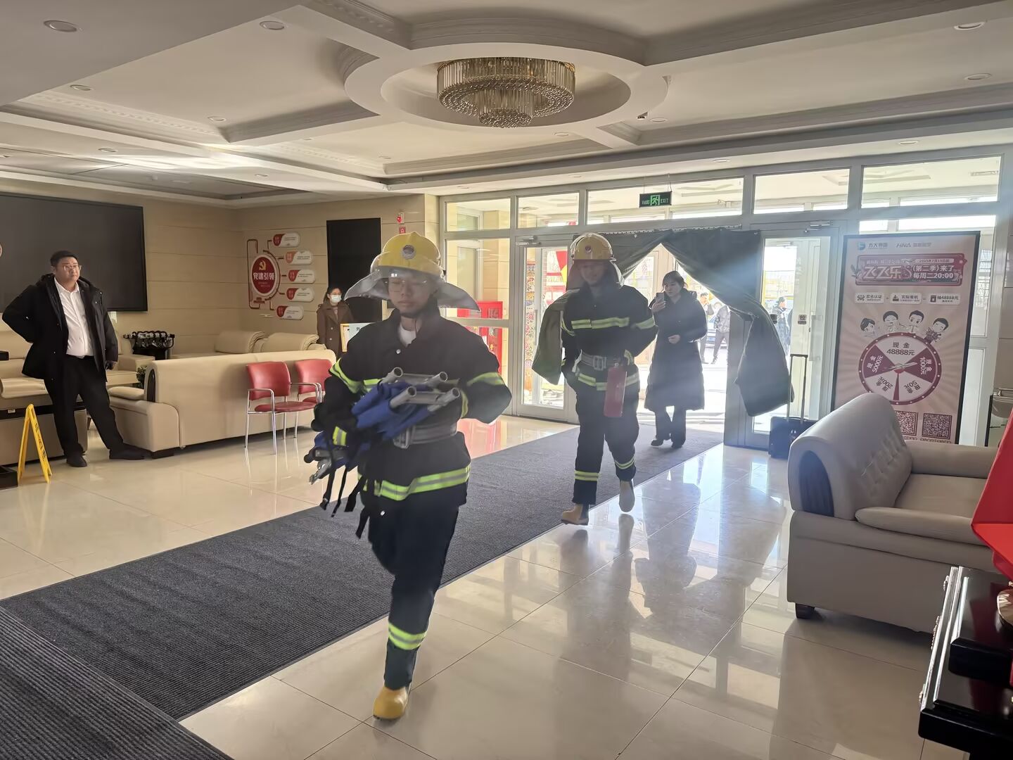 灭火救援组穿戴消防战斗服,手提水带、握着水枪直奔“火场”,精准对接消防栓扑灭火源;疏散引导组举着指引牌,有序引导楼内员工弯腰捂鼻,沿最近的安全通道撤离至室外集结点;医疗救护组提着急救箱,在安全区域快速对“脚扭伤无法移动”的模拟伤员进行包扎;警戒组迅速划定警戒区,防止无关人员靠近;后勤保障组则全程做好物资补给……从“火情”触发到火势扑灭、人员全部疏散,全程仅用时15分钟。各环节衔接流畅,职责分工明确,充分展现了团队出色的应急响应与协同处置能力。