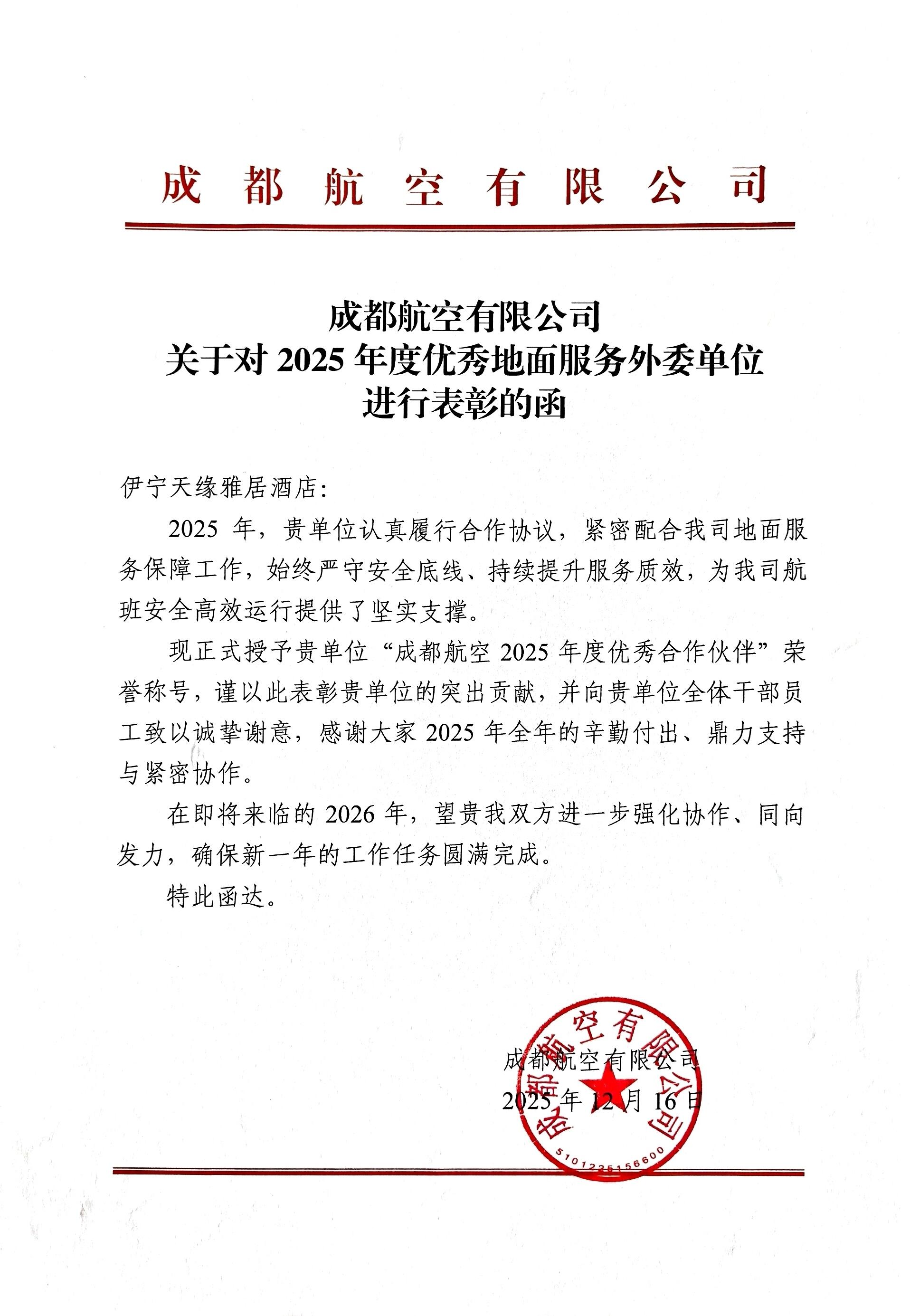成都航空在表彰函中对天缘航旅伊宁分公司天缘雅居酒店全体员工的努力表示感谢,并希望双方在2026年进一步加强协作,共同完成各项工作任务。