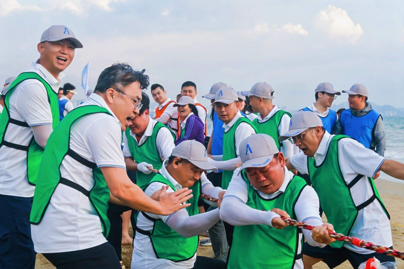 拔河比赛则将整场运动会的氛围推向顶峰,成为力与美的较量、团结与拼搏的展现。比赛前,各代表队队员摩拳擦掌、整装待发,纷纷交流战术、调整状态,有的弯腰压腿活动筋骨,有的相互按摩放松肌肉,团队凝聚力在赛前准备中已然彰显。随着裁判哨声响起,队员们瞬间进入状态,双脚牢牢扎根沙滩,身体后倾与地面形成有力夹角,双手紧握长绳,指节因用力而泛白,青筋微微凸起,每一块肌肉都在全力发力。绳子中间的红绸带在两队力量的拉扯下左右摇摆,时而偏向一方,时而回到中间,紧张的局势让赛场瞬间安静,随后又爆发出更热烈的加油声。“一二!加油!一二!加油!”的统一口号响彻全场,队员们跟着节奏奋力后拽,啦啦队的呐喊声更是一波高过一波,仿佛要将力量直接传递给场上队员。即便中途有人体力透支,也咬牙坚持不松手,队友们的眼神交流与默契配合,成为支撑彼此的强大力量。每一轮比赛的胜负都扣人心弦,赢了的队伍相拥欢呼,输了的队伍也不气馁,与对手握手致意,尽显体育精神。