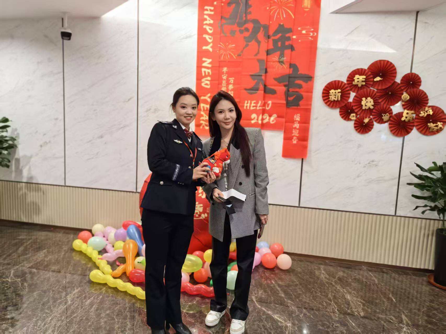 在洋溢着节日气息的安检通道内,红灯笼与吉祥装饰相映成趣,安检员们身着整齐工装,以饱满热情坚守岗位,将“元旦快乐,旅途平安”的诚挚祝福融入每一次细致查验、每一句暖心指引。节日当天,安检员们与旅客开启温馨互动,邀请旅客在红色对联上写福字,再将满载心意的福字赠予旅客手中。旅客的赞美与笑容真切的表达了:“在乌鲁木齐天山国际机场感受到了节日的温暖”,朴实的话语,印证了温暖服务双向奔赴的生动写照。安检通道内,旅客的欢声笑语与安检人员的热情服务交织相融,绘就出一幅暖意融融的元旦平安出行图景。