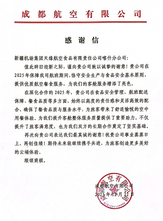 近日,天缘航食喀什分公司收到成都航空有限公司发来的感谢信及“2025年最佳合作伙伴”奖牌,这份双重表彰既是对分公司航空餐饮保障服务的高度认可,也标志着双方协同发展的合作关系迈上新台阶,为喀什地区航空运输服务高质量发展注入强劲动力。