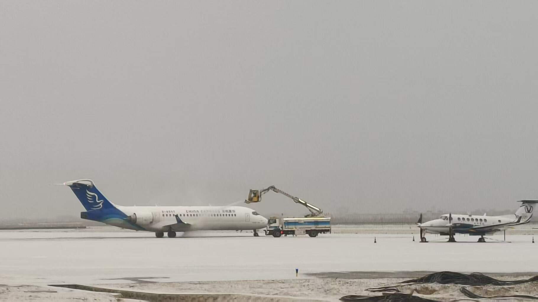 在航空器保障环节,机场机务人员严格遵循行业规范和操作流程,对停靠航空器的机身、机翼、起落架等关键部位进行细致检查,并根据结冰情况及时开展除防冰处理,从源头上消除航空器飞行安全隐患。