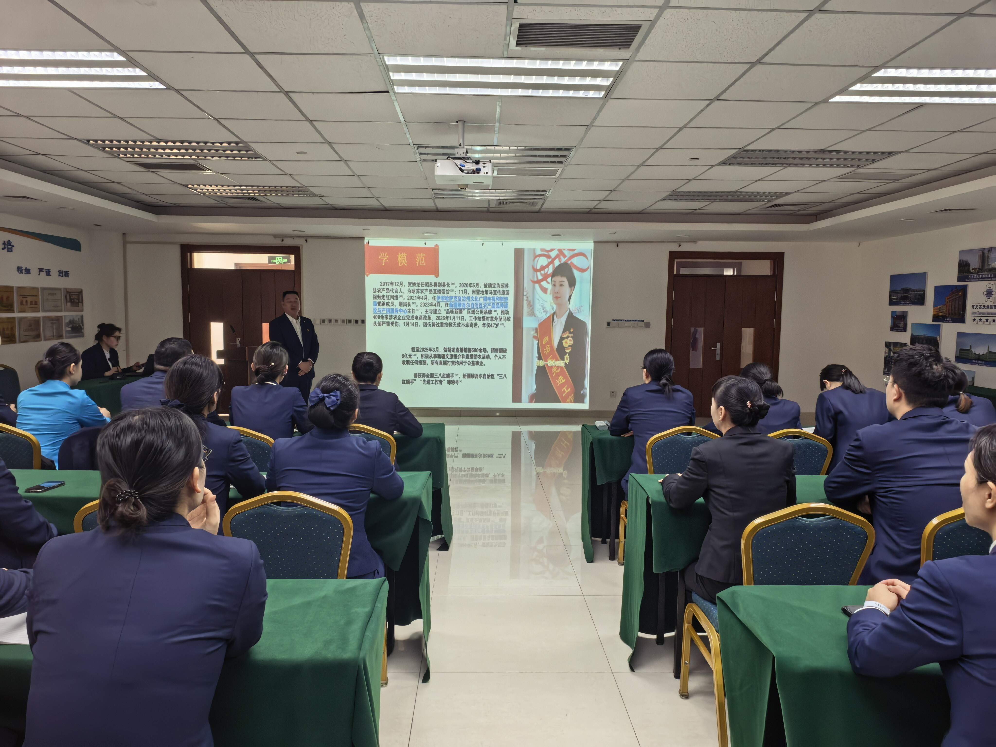 活动伊始,全体参会人员集体合唱了《公民道德歌》。在“学模范”环节,活动聚焦扎根新疆、奉献一生的贺娇龙同志先进事迹,通过观看事迹短片、讲述感人故事,全体员工深入了解了贺娇龙同志从基层干事到推动新疆农产品品牌建设的奋斗历程。她扎根边疆数十年,以务实创新的勇气直播带货推广农产品、雪地策马宣传新疆旅游,主导建立“品味新疆”区域公用品牌,推动数百家涉农企业完成电商改革,用生命践行“宣传新疆,我永远都会全力以赴”的诺言。