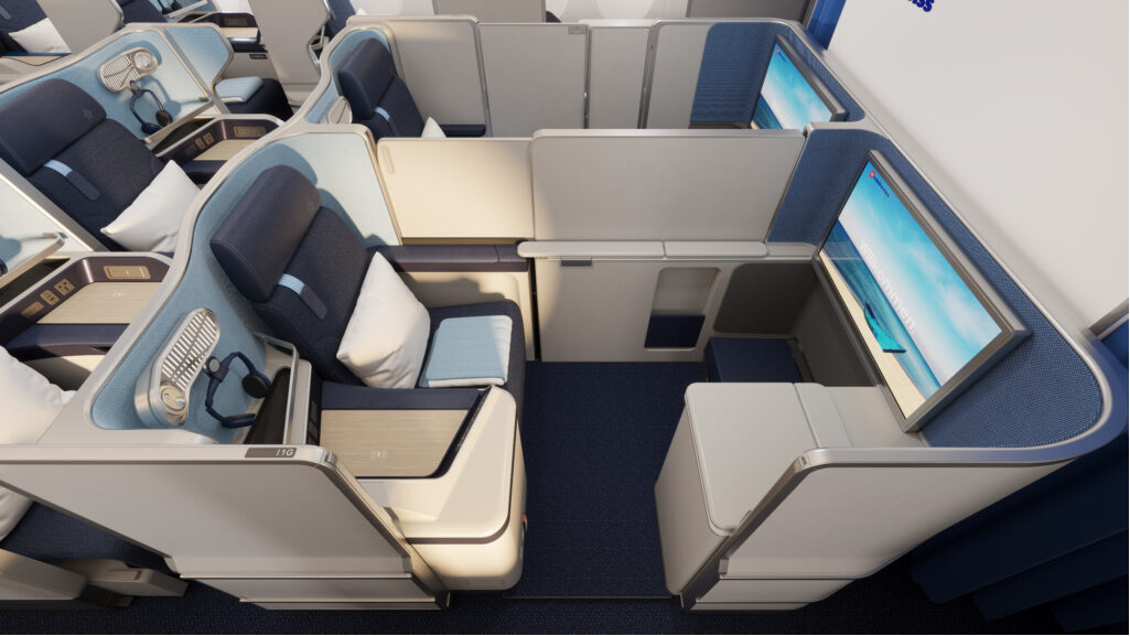商务套房配有可平放的座椅、可关闭的私密门、32英寸显示器、储物空间以及记忆海绵枕头。