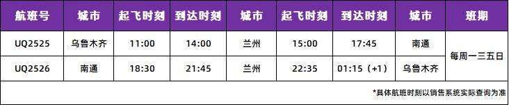 新航线班期为每周一、三、五、日。去程航班UQ2525,11:00从乌鲁木齐天山国际机场起飞,14:00抵达兰州中川国际机场,15:00从兰州中川国际机场起飞,17:45抵达南通兴东国际机场。返程航班UQ2526,18:30从南通兴东国际机场起飞,21:45抵达兰州中川国际机场,22:35从兰州中川国际机场起飞,次日凌晨01:15抵达乌鲁木齐天山国际机场。