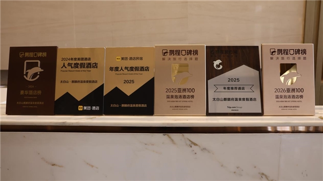 2023 年,酒店初露锋芒,便一举摘得 “美团年度人气亲子酒店”“年度消费者首选品牌温泉” 双项大奖,迅速获得市场认可;2024 年,持续深耕体验升级,斩获 “美团年度人气度假酒店”“携程豪华酒店榜” 等荣誉,品牌影响力稳步提升;2025 年,口碑与实力双丰收,先后入选 “携程口碑榜”、获评 “携程年度推荐酒店”“美团年度人气度假酒店”,成为太白山度假市场的标杆之作;2026 年开年,酒店更是凭借突出的温泉品质与度假体验,成功入选 “2026 亚洲 100 温泉泡汤酒店”,跻身亚洲温泉度假酒店第一梯队。