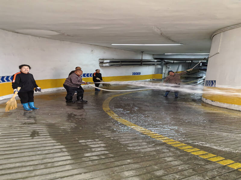 在办公楼内,保洁员们踩着梯子开展高空作业,逐一清除天花板的蛛网与尘网,仔细擦拭墙面、楼梯扶手、指示牌等易积灰部位。在公寓楼及园区,保洁团队对小区主干道、单元门厅和顶棚、楼道走廊逐一清理,清除绿化带中枯枝败叶和白色垃圾,有序整理非机动车棚车辆停放,清除积存落叶与杂物。在地下车库,工作人员清洗地面,扫除灰尘,清淤排水沟,有效提升视觉感受,为业主营造了整洁有序的停车空间。