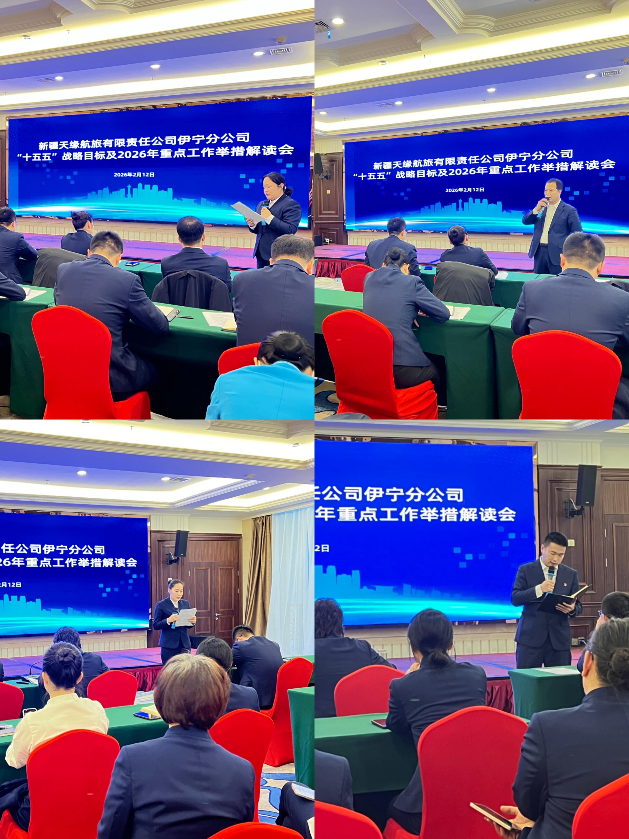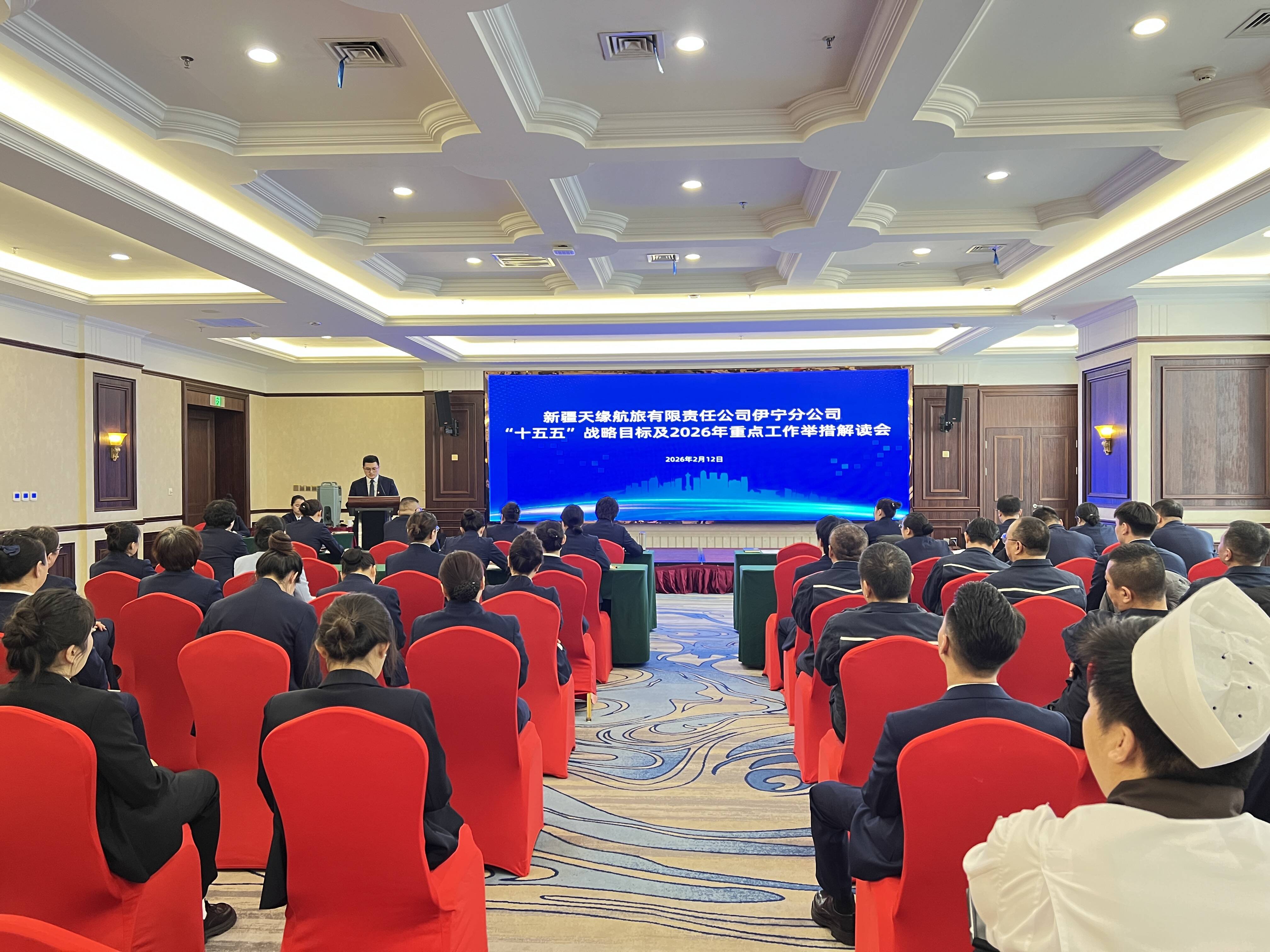 (通讯员 谢雨彤)为深入贯彻落实新疆机场集团及天缘航旅公司战略部署,全面统一思想、明确任务、压实责任。2026年2月12日,新疆天缘航旅有限责任公司伊宁分公司在伊宁天缘国际酒店组织召开“十五五”战略目标及2026年重点工作举措解读会。天缘航旅公司党委委员、副总经理主持会议,伊宁分公司各单位主管级及以上管理人员参加会议。