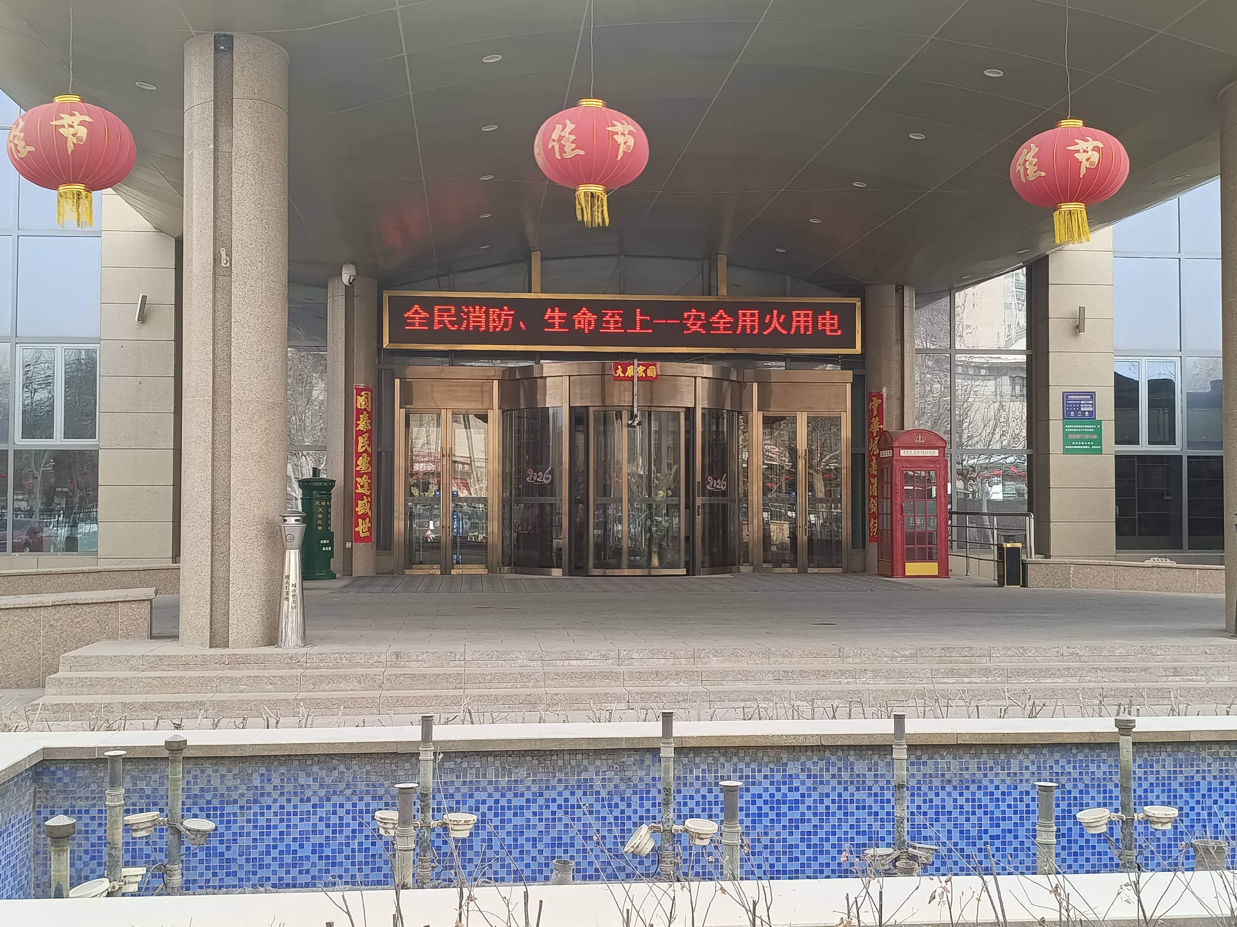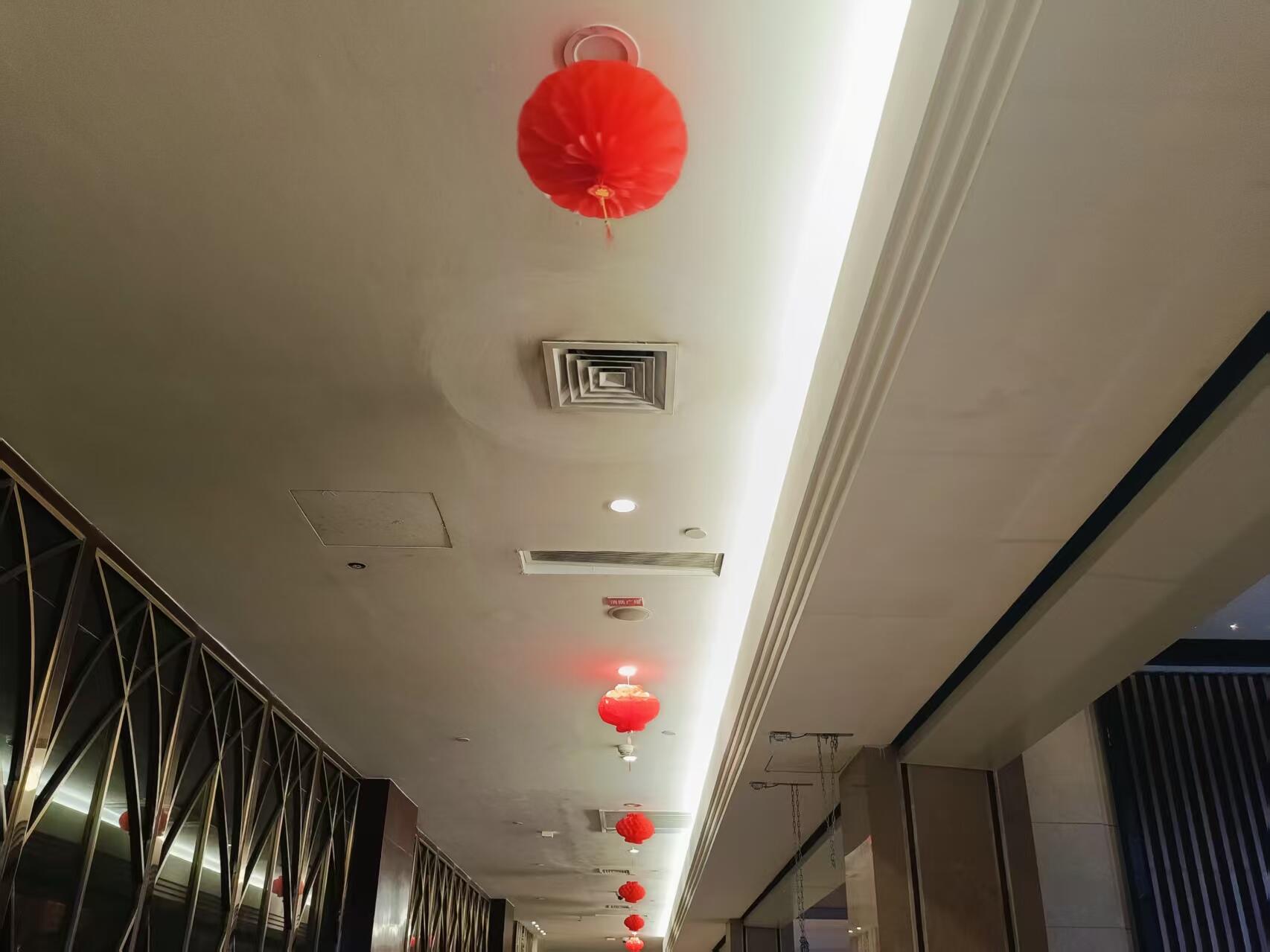 酒店在旋转门两侧及办公楼主入口张贴了春联和“福”字。公共区域布置了多项春节主题装饰:主通道顶部悬挂红色灯笼,沿走廊纵向排列,形成“红灯长廊”;大堂中央设置一棵大型春节主题装饰树,枝头装饰有红灯笼、手写祝福卡和金色挂饰,树下配有马年主题美陈装置,包括骏马造型摆件和“马年大吉”字样展牌,呼应农历马年元素。同时,酒店背景音乐已更换为《金蛇狂舞》《喜洋洋》等传统民乐曲目。