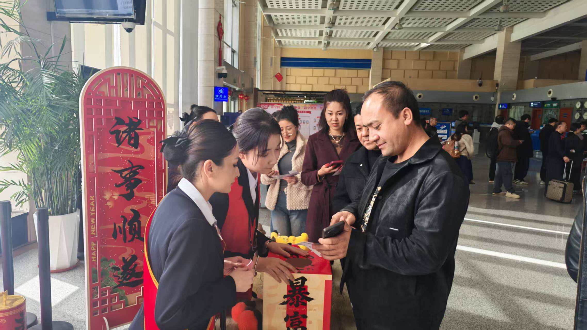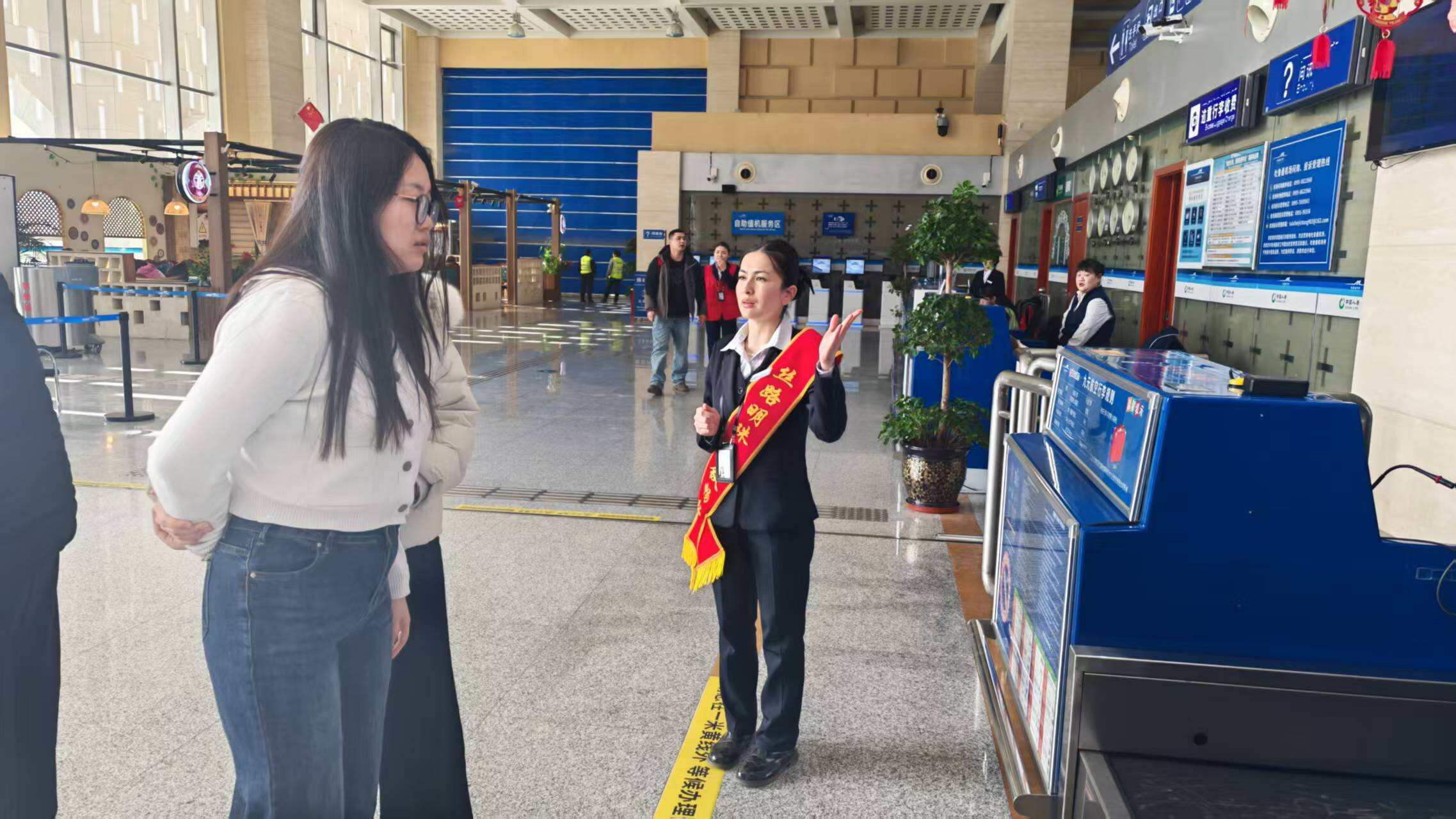 活动现场年味浓郁、暖意融融。航站楼内张灯结彩,融入丝路文化元素与春节喜庆符号的装饰随处可见,营造出“人在旅途,心在团圆”的温馨意境。现场身着统一服装、佩戴“丝路明珠,空铁畅行”绶带的志愿者们热情饱满、分工有序,主动为旅客引导路线、解答咨询、协助参与活动,用贴心服务让每一位往来旅客感受到新春的温暖。