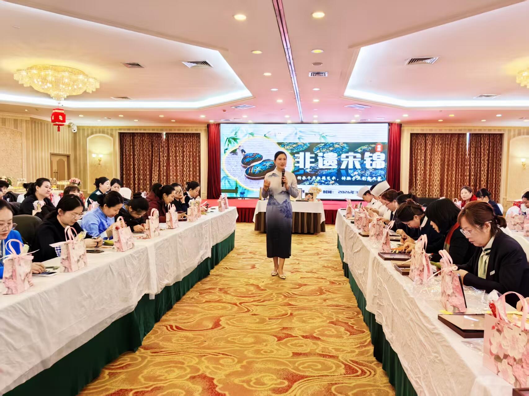 活动现场暖意融融、笑语盈盈。非遗老师以生动翔实的讲解,为大家揭开宋锦非遗的神秘面纱。老师介绍,宋锦作为国家级非物质文化遗产、人类非物质文化遗产代表作,素有 “锦绣之冠” 的美誉,始于宋代、盛于明清,以经纬显花、纹样典雅、色泽温润著称,如同穿越千年的丝织诗篇,承载着东方美学的深厚底蕴。讲解过程中,老师结合实物展示与趣味互动,用通俗比喻拆解工艺要点,不时与女职工交流提问,现场氛围轻松热烈,大家在聆听中感受非遗魅力,在互动中增进文化认同。