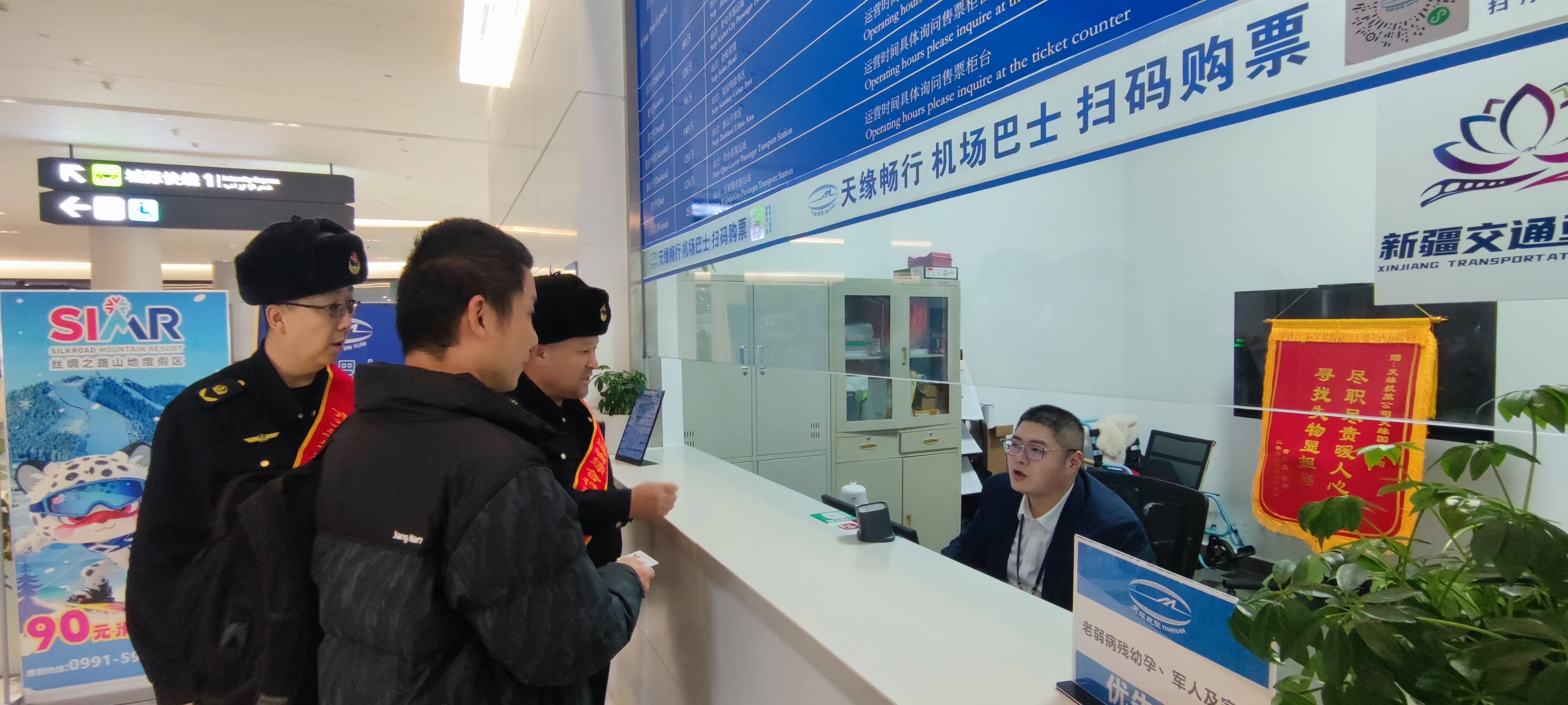 暖心服务践初心,出行保障有温度。聚焦旅客出行全流程痛点难点,天缘航旅公司志愿服务队以航站楼到达层、机场巴士售票柜台、出租车上客区等旅客密集区域为核心阵地,全方位开展便民志愿服务。在枢纽场站现场,志愿者们主动上前为抵离港旅客提供行李帮扶服务,协助旅客搬运行李、装卸物品,重点关注老、弱、病、残、孕等特殊旅客群体,为其提供全流程引导帮扶,切实解决旅客出行中的“急难愁盼”。在机场巴士售票服务柜台,志愿者们亮明身份、靠前服务,耐心为旅客解答机场巴士线路班次、站点设置、票务办理等各类咨询,协助旅客完成扫码购票、行程规划,用细致周到的服务让旅客抵乌第一时间感受到新疆机场的暖心温度。