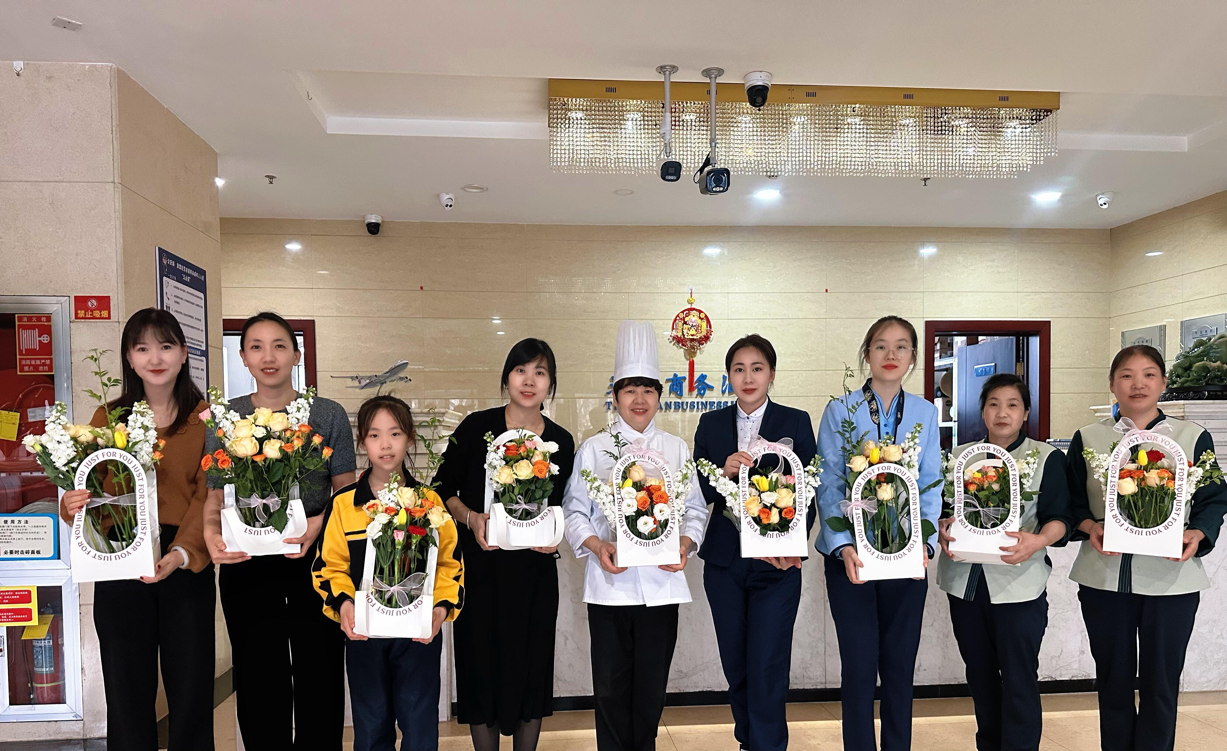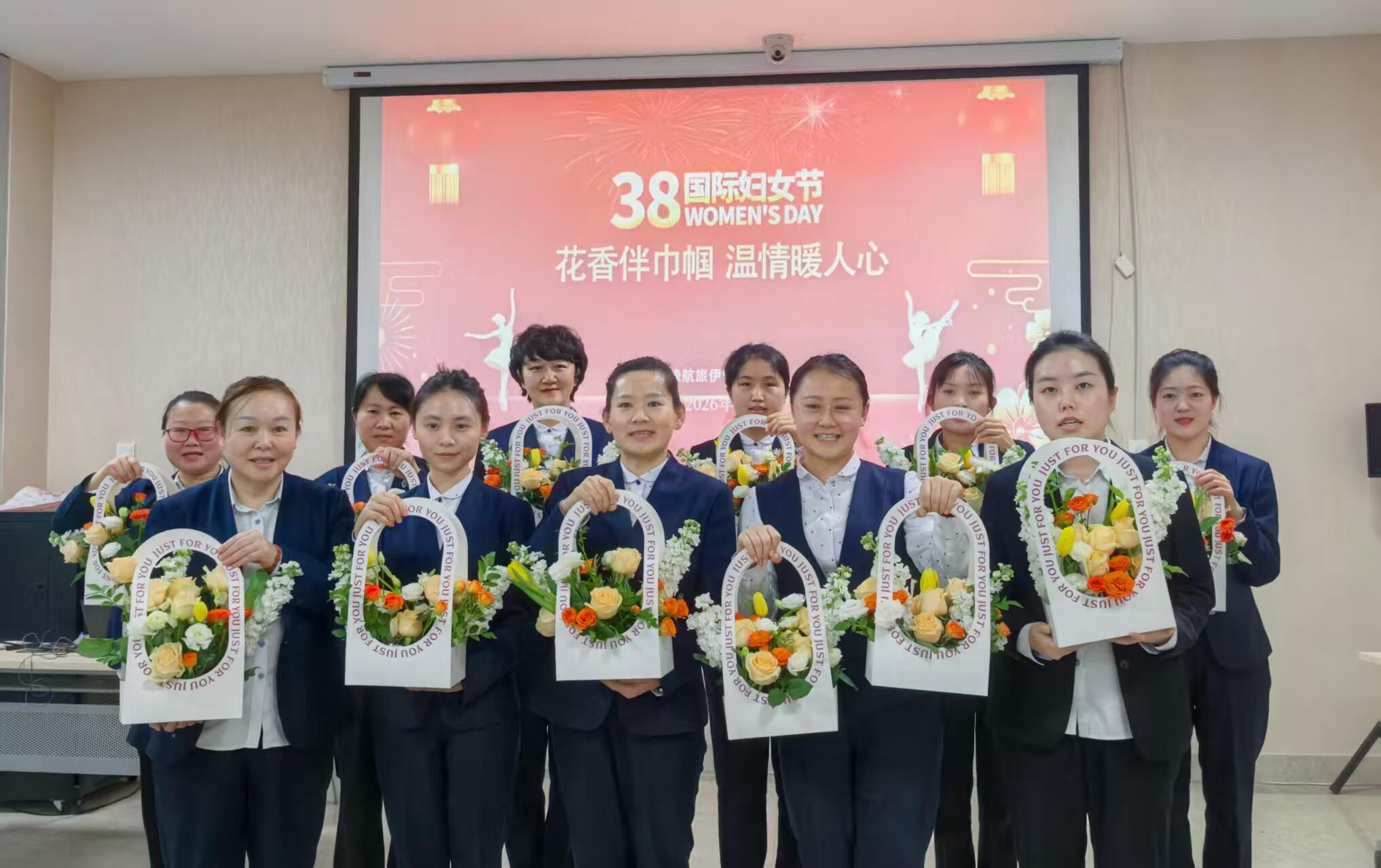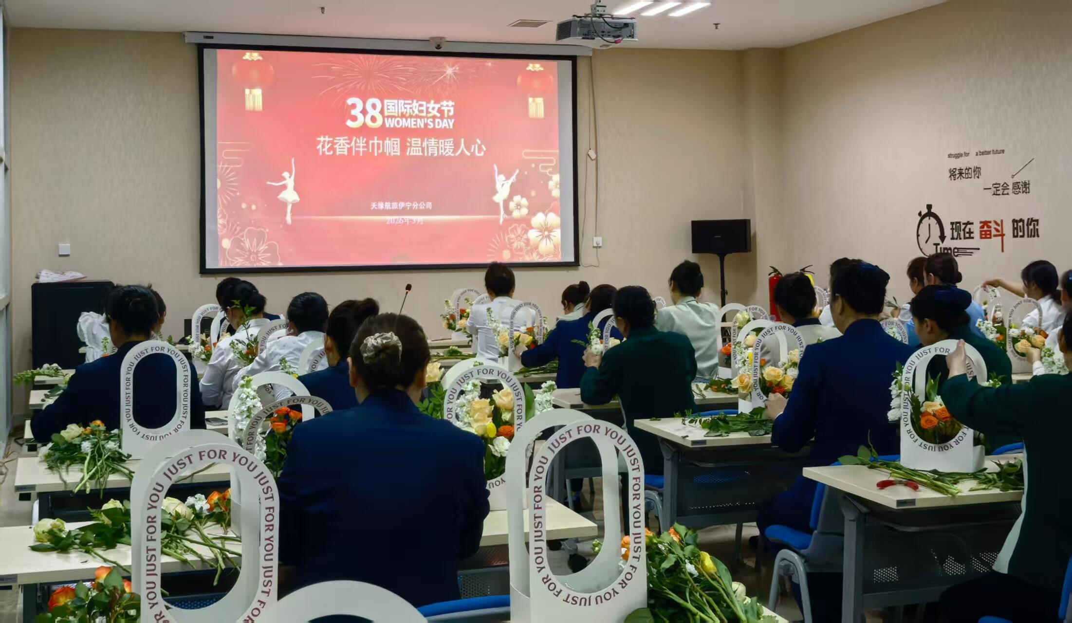 (通讯员谢雨彤)在第116个“三八”国际妇女节来临之际,为丰富女员工精神文化生活,展现女性风采。2026年3月6日,天缘航旅伊宁分公司组织开展以“花香伴巾帼 温情暖人心”为主题的插花活动,分公司全体女员工与入住机组的女性旅客共同参与。