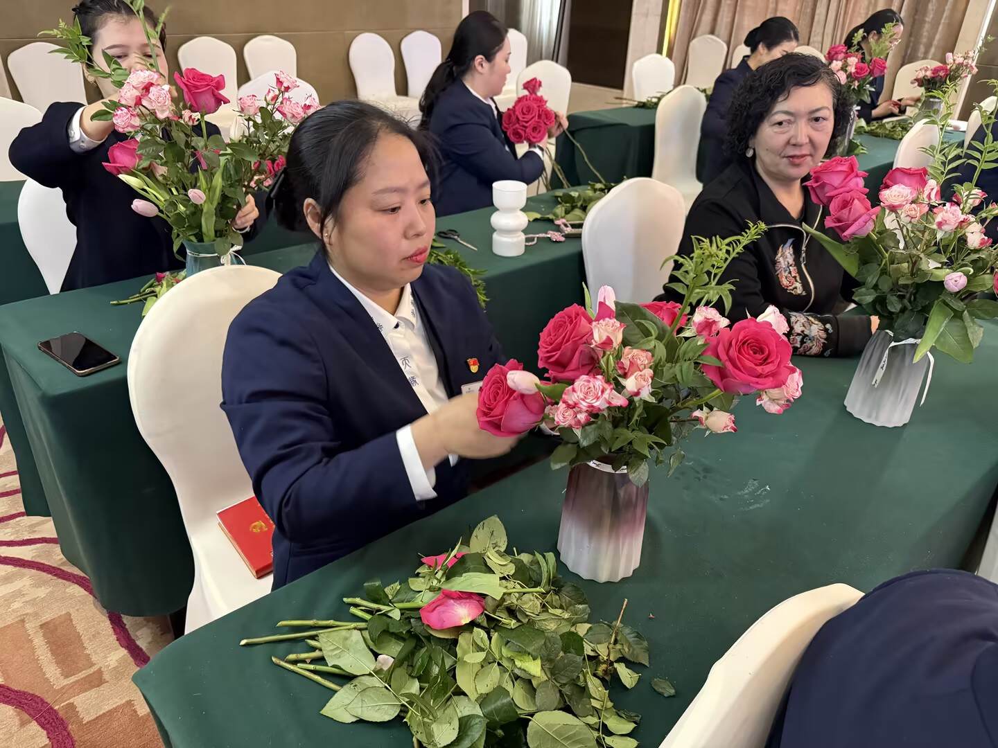 本次活动紧扣传统文化与绿色环保理念,设置文化讲解、花艺实践两个环节。活动现场,工作人员详细讲解“三八”国际妇女节的由来,普及基础插花知识与创作技巧,引导女职工感受传统花艺魅力。女职工们运用郁金香、玫瑰等各色花材,搭配可循环使用的玻璃花器,巧手修剪、精心搭配,沉浸式体验插花乐趣。活动还通过现场评比环节,评选出三名优秀创意奖获得者,并为其颁发精美礼品。同时,各部门同步为女职工送上鲜花与花瓶,以暖心举措传递节日祝福。