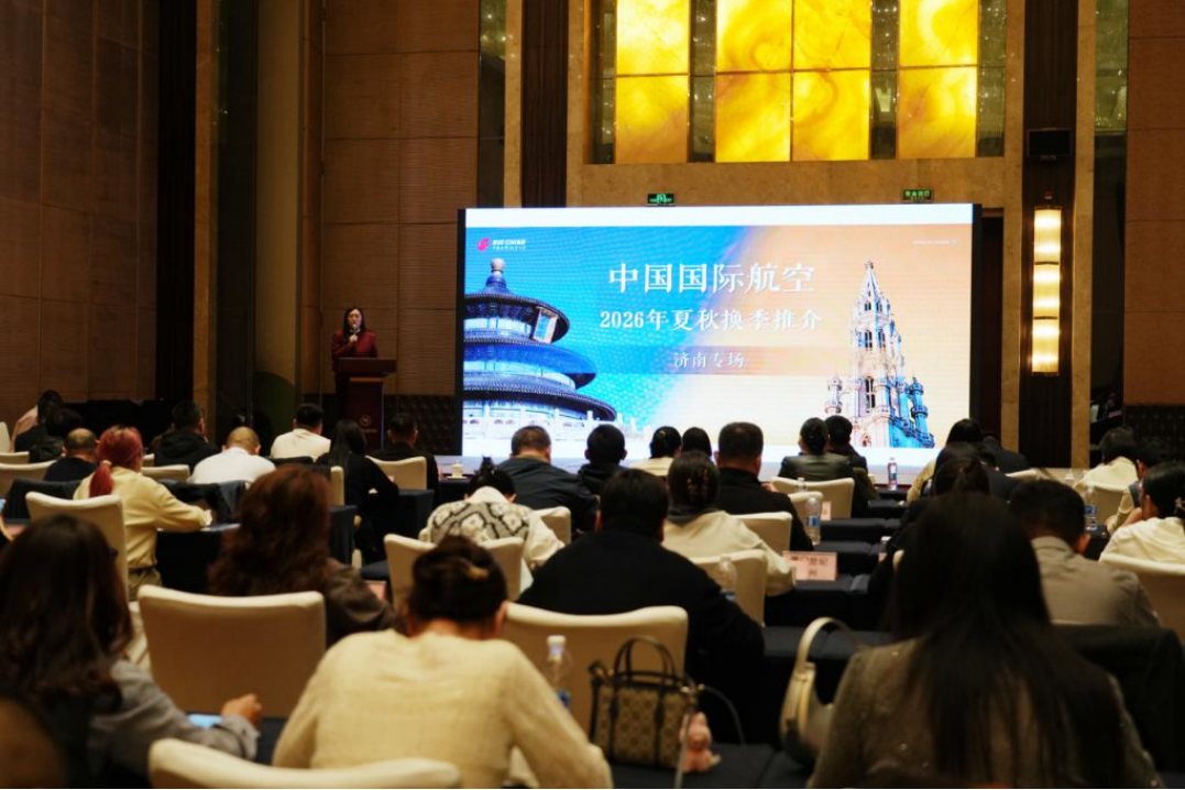 近日,济南机场携手国航系各航空公司,在济南喜来登酒店会议厅开展2026年夏秋航季市场交流会。现场济南机场与山东航空、中国国际航空、深圳航空、澳门航空等国航系成员单位、省旅游推广中心、旅行社等代表齐聚一堂,共话航季新机遇、共谋航空文旅新发展。