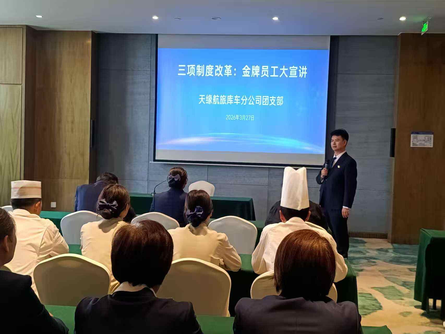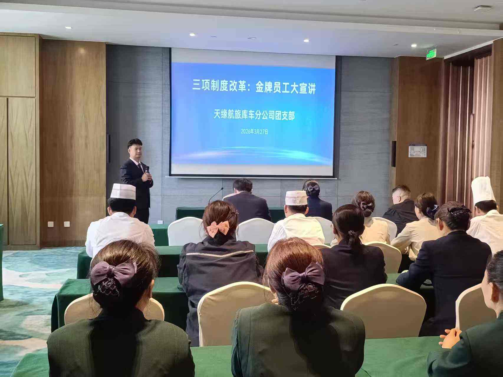 为贯彻落实上级团委关于推进三项制度改革的部署要求,发挥先进典型的示范引领作用,3月27日,新疆机场集团天缘航旅有限责任公司库车分公司团支部在库车天缘国际酒店三号会议室组织开展了“三项制度改革金牌员工大宣讲”活动。