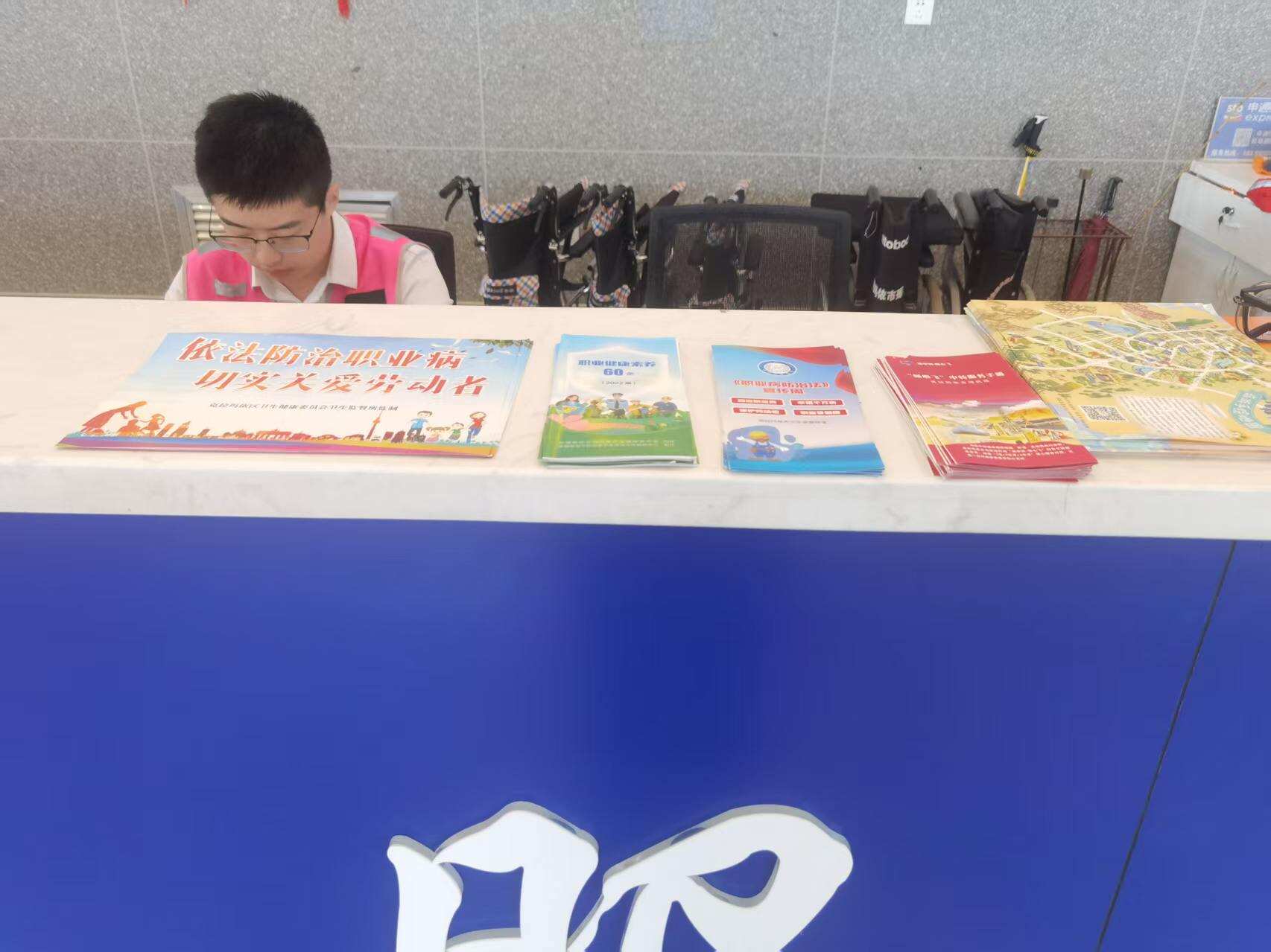线下全面营造宣传氛围,在航站楼综合柜台、中转柜台等关键区域,摆放职业病防治宣传手册,供员工及往来人员自主取阅学习。场区LED显示屏不间断滚动播放职业病防治宣传资料、健康防护科普内容,持续强化宣传效果。