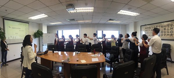 在培训中,辅导老师首先让综合服务中心的员工们进行“互动拍打操”,以此来解释人与人互动交往中不同关系所需要的人际距离。