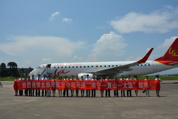 7月7日,随着一架来自广西北部湾航空公司的EMB190飞机降落在黄山机场,标志着南宁-黄山航线首航成功。之后,该架飞机将起飞前往东北著名旅游城市大连。南宁-黄山-大连航线的开通,进一步满足了暑期航空市场需求,为三地市民出行带来了便利。此次执飞的北部湾航空公司成立于2015年3月,开通该条航线,也是公司首次“登陆”黄山。
