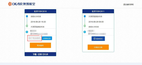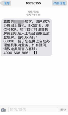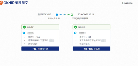 选座成功后,网页上会显示当前航班的登机信息,旅客可通过选择相应按钮选择下载登机牌或直接打印登机牌。办理成功的同时,内地手机用户会收到相应办理成功短信,其中包含取消值机时需要的验证码内容,请妥善保存该信息。