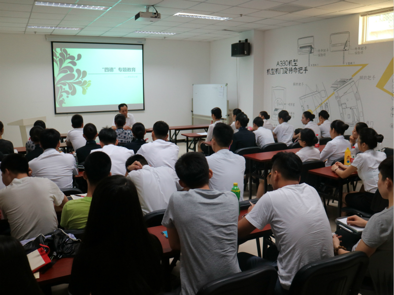 客舱部总经理何军在“四德”教育开始前进行了讲话。他结合青年空勤人员自身的情况,采取举实例、讲故事的方式从“社会公德、职业道德、家庭美德、个人品德”四个方面讲解,他提出,工作是一个平台,无论选择在哪一个平台,都要考虑如何在平台上展现“舞姿”。针对新加入乘务团队的年轻人,何总提出了四点要求:一是严格恪守岗位职责,做高素质的乘务员,在现有岗位上能够实现自身的拔高。二是对待工作、生活、家庭都得做到有敬畏,有责任,有感恩。三是严于律己,为自己的行为树立标准。四是对于社会与父母都要给予回报。