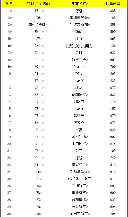 货主或代理公司在交运货物前,请确认交运货物是否为 1号货站收运的30个国际航班的货物,具体航班二字代码和前缀如下:
