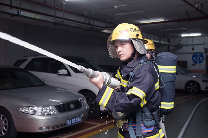 8月24日,消防安保管理中心航站楼地下停车场进行了消防大型演练。 15点30分,消防演练正式开始,各参演单位和相关人员各司其职,迅速到达预定位置。根据消防演练预案,当班2名安全员在巡逻时发现停车楼负一层B区1道有辆面包车自燃冒烟。1人立即用对讲机上报监控室和班队长,1人利用附近灭火器进行初期火灾的扑救。监控室负责第一时间将相关信息报警。消防监控中心接到报警后立即发出出警命令, 得益于平时钢铁般的铸造训练,出警消防人员选择距离最短的路线,迅速到达了事故现场。消防员赶到后使用两个消火栓出水枪和35公斤干粉灭火器进行灭火;在灭火的同时,对火场附近人员靠最近安全出口进行疏散,对进出火场区域的车辆进行疏散。3人组成安全警戒组,对通往着火灾区域的道路实行封闭,防止无关人员和车辆靠近着火区域,做好现场保护工作。