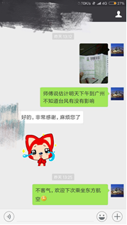 11:00分,旅客打来电话,沟通之后,早已下班回家的刘成联系了快递员,为旅客办理了邮寄手续......而在最后的聊天里刘成还不忘说上一句:欢迎下次乘坐东方航空!”