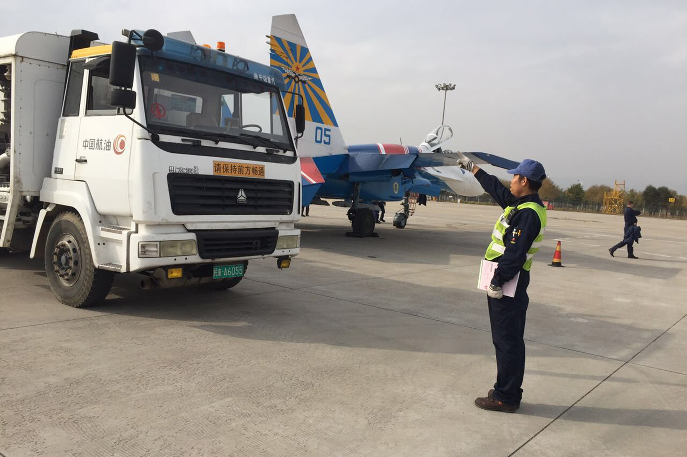 10月25日12时左右,参加珠海航展的俄罗斯“勇士”飞行表演队降落在呼和浩特白塔国际机场进行转场飞行。中国航油内蒙古分公司呼和浩特航空加油站(以下简称“呼和浩特航空加油站”)高度重视、严阵以待,按照“全、细、实、严、好”的工作标准圆满完成了飞行表演队供油保障任务,充分展现了“召之即来、来之能战、战之必胜”的草原“航油铁军”优良精神风貌。