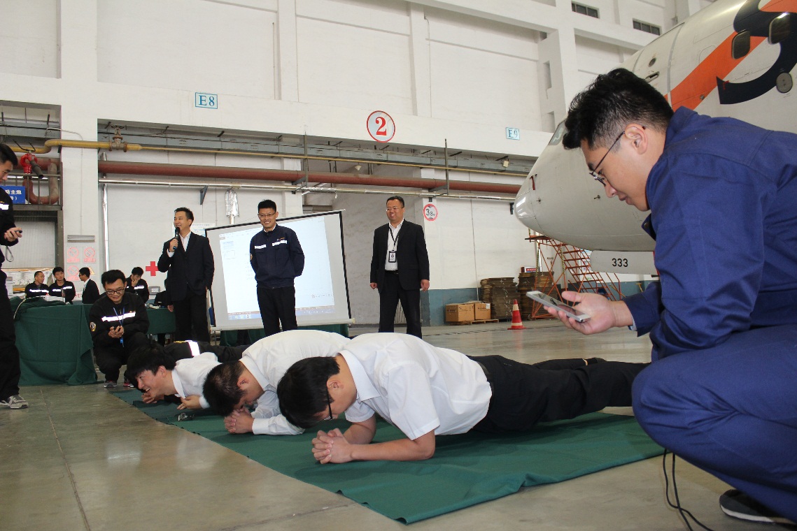 为了确保赛事圆满,工程技术公司成立了赛事组委会,下设竞赛工作组、裁判组、保障组。赛前,组委会组织召开了数次工作会议,对赛事规则、试题酝酿、场地规划、设施准备、竞赛流程等各个方面进行了详细的讨论和周密部署。本次竞赛的五支参赛队伍分别来自青岛基地航线中队、青岛基地定检中队、北京基地、烟台基地、厦门基地,每支队伍选派三名队员参赛,重庆基地观摩竞赛。竞赛共包含两个项目,分别为绕机检查和工作现场检查,考察内容贴合工作实际,有效检验维修人员在实际工作中的严谨性和规范性。同时,为了倡导机务员工健康工作,增强体能素质,比赛中还加入了平板支撑环节。