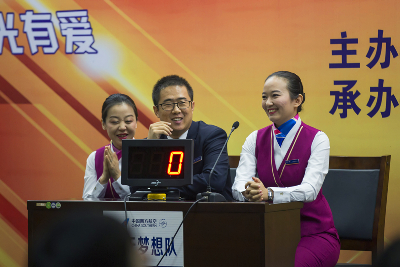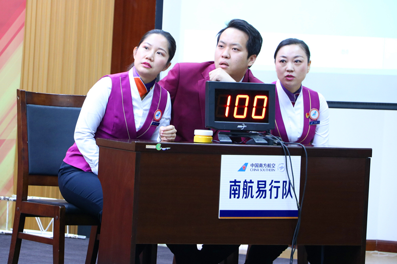 11:30,团体赛开启。共有四组参赛队,分别为阳光值机队、天山雄鹰队、南航易行队、蓝天梦想队。在必答题、抢答题、风险题三个环节的较量中,最终“南航易行队”以190分的高分取得了团体赛的冠军。