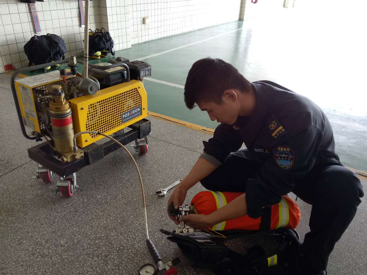 12月9日上午,大队在周五车辆装备检查保养过程中,发现空气呼吸器故障,当天值班中队长接到故障报告后,立即组织队员对故障器材进行排查。经查,原来是气瓶进气口开关密封胶圈老化漏气,更换后恢复正常。