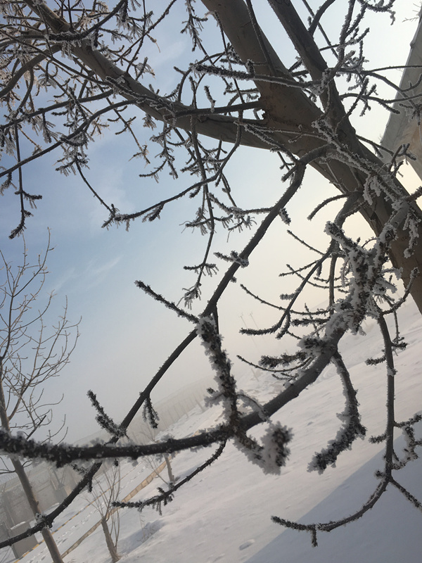 由于大雾天气湿度较高,机场附近的植被都披上了白色的霜花,形成了美丽的雾凇景观。一簇簇银色的松针如同银菊绽放,形成独特的美景。雾凇形成的苛刻条件首先要求空气中有充足的水汽。其次,雾凇的形成要求既天晴少云,又静风,或是风速很小,本场都具备了这些条件。空中的云像是大地的一床被子,夜间有云时,削弱了向外的长波辐射,使地面气温降低较慢,昼夜温差相对较小,近地面空气中的水汽就不会凝结。若是掀掉了这床被子,热量就更多地散发出去,使得地面温度降低,为水汽的凝结提供了必要条件。雾凇初始阶段的凇附,吸附微粒沉降到大地,净化空气,因此,雾凇不仅在外观上洁白无瑕,给人以纯洁高雅的风貌,而且还是天然大面积的空气“清洁器”。