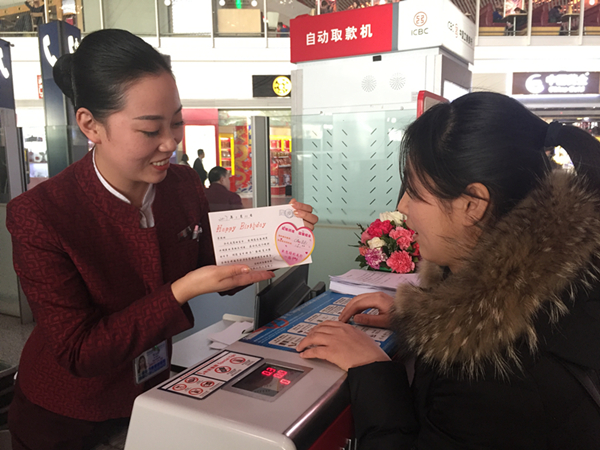 国航北京地服值机为开展创新服务,在2017年的开端,在F19员工服务柜台推出“生日惊喜卡”和“员工候补柜台提示卡”的创新服务。“生日惊喜卡”是对在生日当天来到F19员工服务柜台的“小伙伴”和“亲人”,在送上生日祝福的同时,为他们准备了一张小小的生日卡片,在为旅客办理乘机登记手续的同时赠与旅客,让旅客生日当天体会到来自国航北京地服的特别祝福。“员工候补柜台提示卡”是国航北京地服的“心”礼物,对每一位来到F19员工服务柜台候补的“小伙伴”和“亲人”提供一张贴心的心型提示卡片,卡片上提示了候补的航班号及回柜台办理乘机登记手续的时间,“小伙伴”和“亲人”有了这张“心”卡片,就会抚平候补航班的焦虑心情,同时能深深的体会到来自国航北京地服的细心和暖心,我们也收获了来自“小伙伴”和“亲人”们的每一份珍贵的感动。