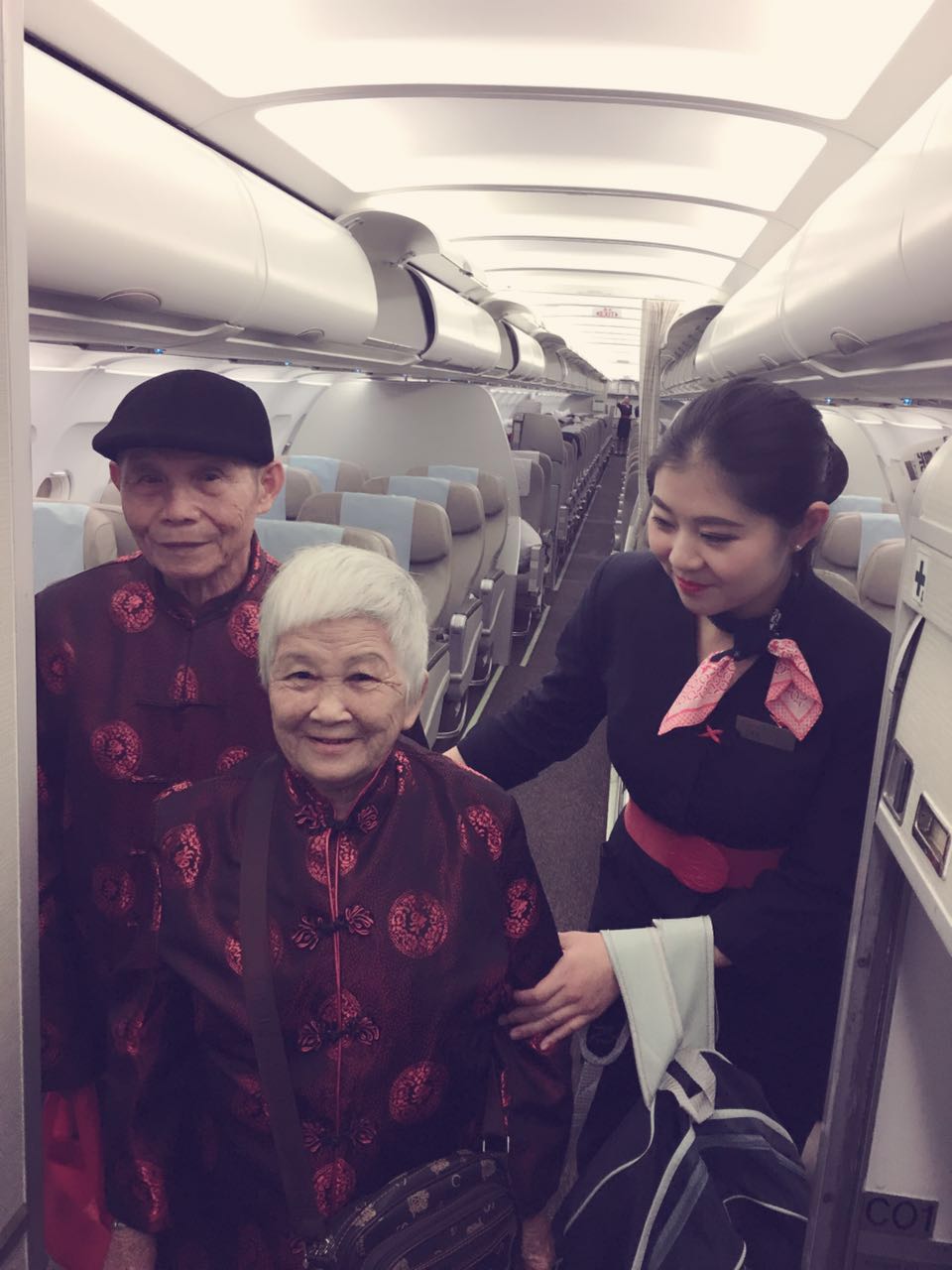飞行过程中,老人因长时间的路途颠簸,身体一度不适,负责该区域的乘务员的王春烨得知后,即刻为老人测试了血压,并一路上进行了悉心照料。“爷爷奶奶,请问您们是否需要茶水?是否需要上卫生间?”虽然很忙,但他依然记挂着两位老人,定时送去毛毯与温水,照料的十分细致周到。