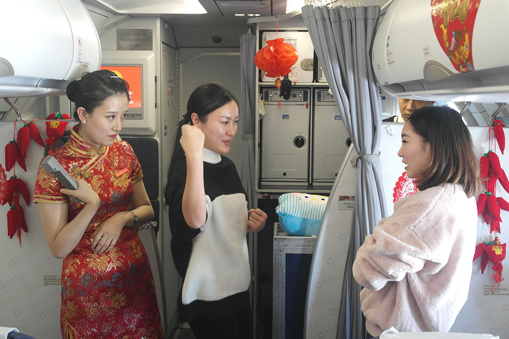 在“你来比划我来猜”互动小游戏中,每一位旅客开动脑筋,竭力比划;客舱里红彤彤的“小辣椒”挂件和喜庆的福字年画,映衬着旅客一张张开心的笑脸,让人感受到了浓浓的年味。