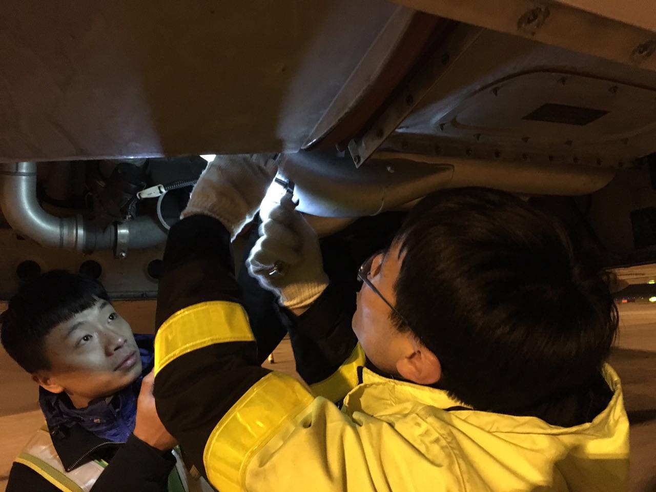 有了总体的思路,小组成员经过合理分工后待飞机航后落地立即投入到紧张的排故工作之中。在对惰性气体发生系统管路渗漏检查时发现惰性气体散热器冷气路有明显的渗漏现象,分解该管路后发现管路封圈破损严重,如果渗漏造成冷气量不足就会引起热气量增大,热气量增大后混合气体的温度就会上升,超过系统限定值就会造成气体超温的故障信息。但是为了判断是否是漏气引起的超温故障,排故小组更换了该破损封圈后把这一段管路与B-6429飞机该管路对调。此时已是10日凌晨,小组成员袁兴海、韩龙和刘向南已经差不多一天一夜没合眼了,但是尽快排除故障的信念战胜了身体的疲劳,所有小组成员顾不上休息继续紧张奋战。经过整整一夜的紧张工作,直到10日早上7点,完成了B-6929和B-6429管路的对调工作,经过测试再无气体渗漏。10日当天晚上排故小组又对B-6929飞机线路进行排查,确认了正是破损封圈引起的漏气造成的气体超温故障。