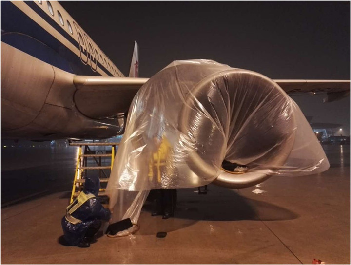 后半夜,雨势减小,经评估可以展开ECU更换工作。时间定格在凌晨1点,两位机务兄弟正在做更换ECU的最后安装工作,一个,两个,三个,机械的动作并没有让他们丢掉认真工作的态度;一处,两处,三处,衣服上多处被淋湿也没有阻挡他们工作的热情。然而雨中更换ECU是很危险的,只要稍微进点水,这个组件就可能坏掉了。没关系,没有条件创造条件,他们拿了一大块透明塑料布搭了个简易防雨棚,不仅巧妙解决了进水的隐患,同时也为机务兄弟在雨中尽可能的提供舒适的工作环境,从而完成ECU的更换。这也不乏为一道独特的风景线啊!