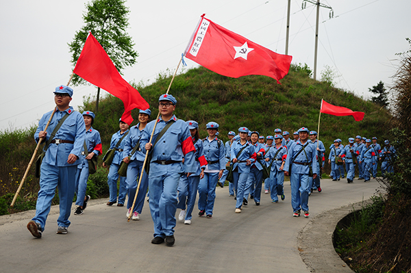 在体验教学部分,全体党员赴普安县楼下镇重走7公里红军路,全体党员身着红军军装、挎着“为人民服务”的斜挎包,一路齐唱红歌,沿着80多年前红军走过的长征路从泥堡纪念馆徒步走到岩脚寨,途中耐心听讲解员讲解了红军长征的故事。在堵嘎寨头红军迎送点,全体党员体验了当年老百姓送土鸡蛋,大碗南瓜汤,窝窝头的场景,共同缅怀那段不寻常的历史,珍惜现在美好的生活。整个活动在烈日下持续了三个多小时,虽然烈日当空、山路崎岖,但是没有一人掉队,全部按时到达目的地。