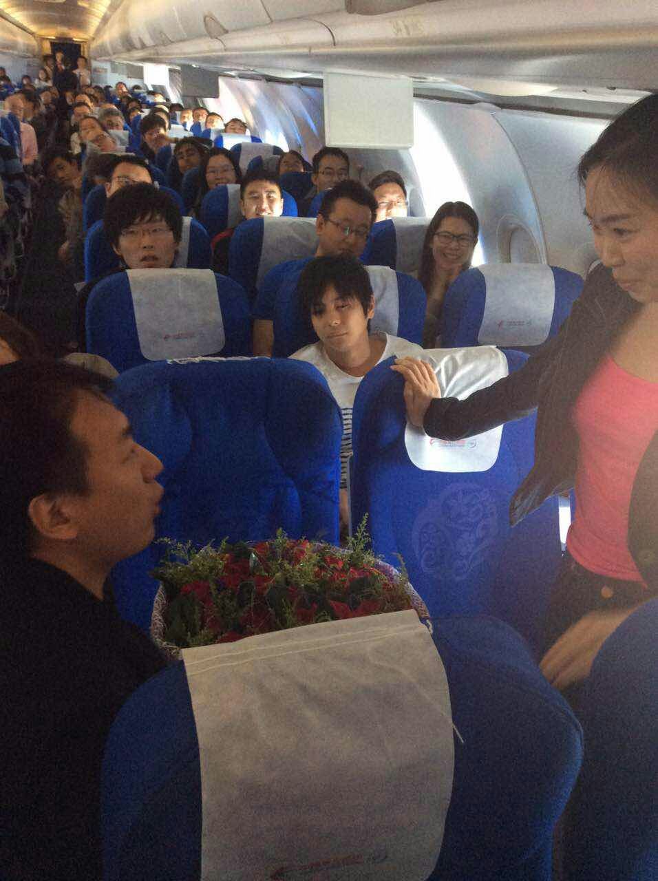 当班乘务长赵良三听到消息后非常热心地应了下来,并灵机一动为男乘客求婚编写了一段煽情的广播词。在客舱餐饮程序结束后。乘务长赵良三走到客舱里拿起话筒:“女士们、先生们:今天是个特殊的日子,更是一个情深意浓的时刻。此时的他正怀揣小兔到处撞,而此时的她,或许并不知情,但相信接下来,他将用全部真心,唤醒心中的公主,做她一辈子的王子。” 所有乘客都被接下来的一幕吸引住了,随即客舱里响起了掌声和欢呼声。。。。