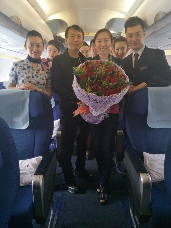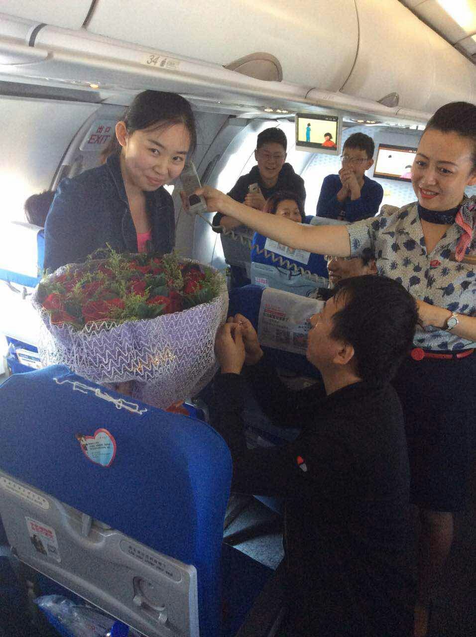 “金风玉露一相逢,便胜却人间无数”。近日,在东航北京分公司机组执飞的MU2102北京至西安航班上,一对情侣登上了飞机后,男士悄悄找到乘务长,表示航程中会向相恋多年的女朋友求婚,给女朋友一生难忘的回忆,自己箱子里准备了一大束鲜花,希望乘务长能协助保管并帮忙。
