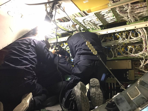 在改装过程中,奥凯航空维修工程部改装团队始终坚持自主创新、攻坚克难。为提高机队的安全性、及时性、有效性,大幅度提升飞机运行的安全水平,改装团队制定了详细的改装方案,并积极协调改装前的生产准备。机务工程师在改装前期开展了相关技术培训,使得改装团队对改装工作了然于心,从而进一步减缓和消除改装工作带来的安全风险。机务工程师们克服了电子舱内空间狭小、飞机线路施工复杂、拆装部件多等实际问题,最终顺利通过验收,并获得局方监察人员好评。